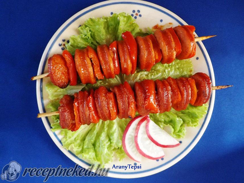 A saslik pálcára felváltva húzzunk rá egy karika kolbászt és 1 kocka paprikát. A kész nyársakat fektessük az előkészített tepsibe.