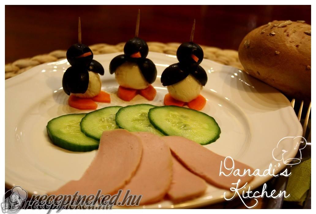 Az olíva bogyók egy részét hosszában félbevágtam. A sárgarépa karikákból kis háromszöget vágok ki – ami majd a pingvinek csőre lesz. A megmaradt rész pedig a talpa.