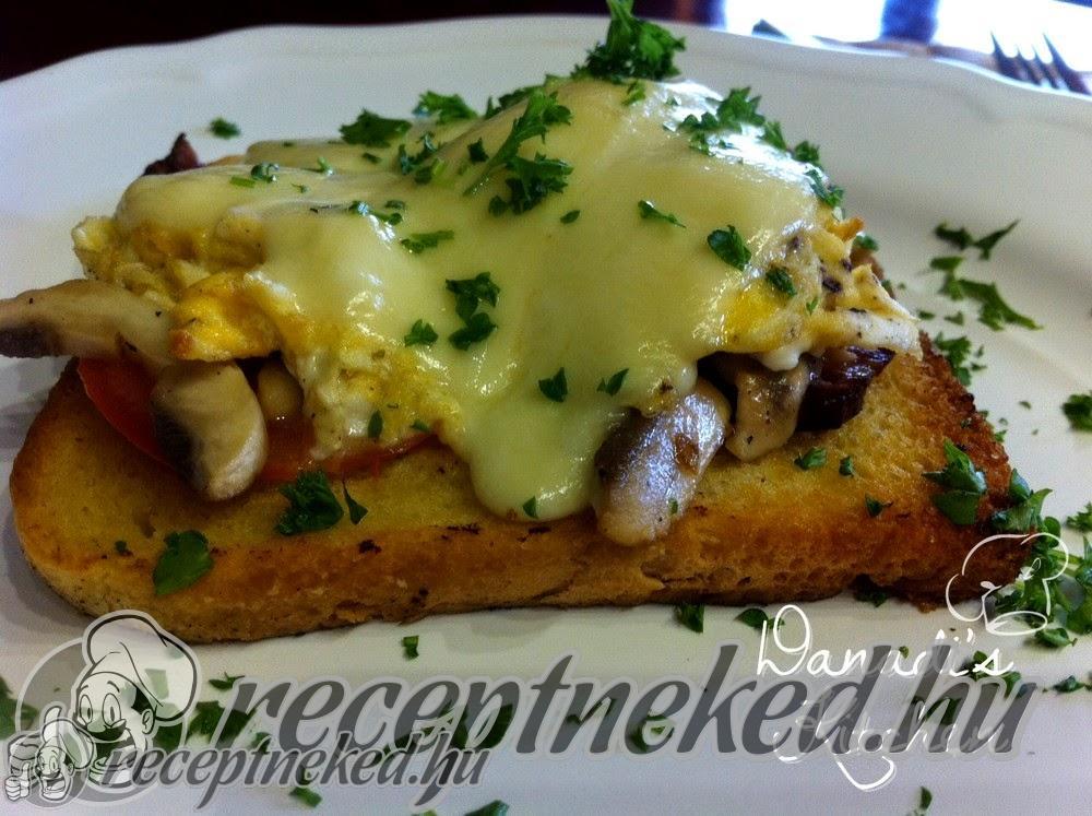 A paradicsomot felkarikázzuk és a kenyérre tesszük, erre jön a gomba és a bacon, majd a tetejére a tojás rántotta és a szeletelt mozzarella.