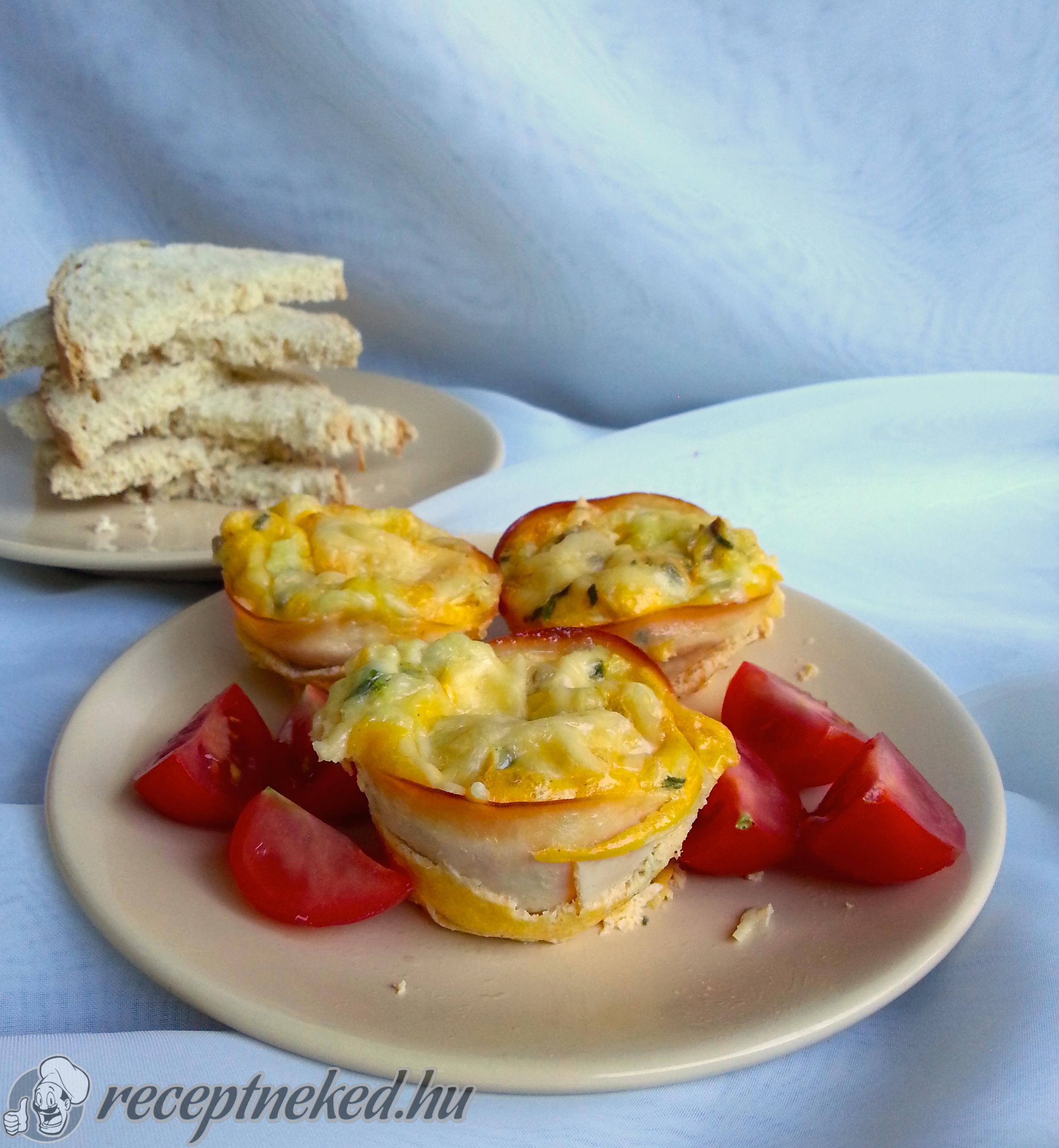 Egy muffin formát kivajazunk és a mélyedéseket 2 szelet sonkával kibéleljük. 2/3-ig megtöltjük a tojással, a tetejére rászórjuk a maradék reszelt sajtot.