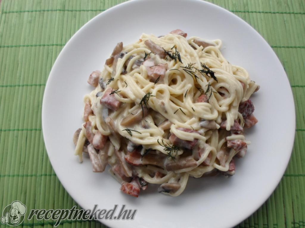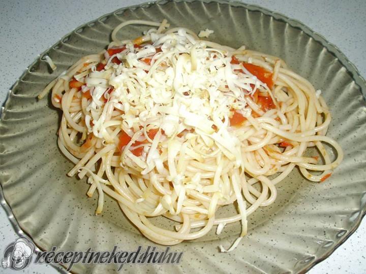 Az időközben megfőtt tésztát szűrjük le, tegyük egy tálba, öntsük rá a kész szószt, bőségesen szórjuk meg reszelt sajttal, majd melegen tálaljuk.