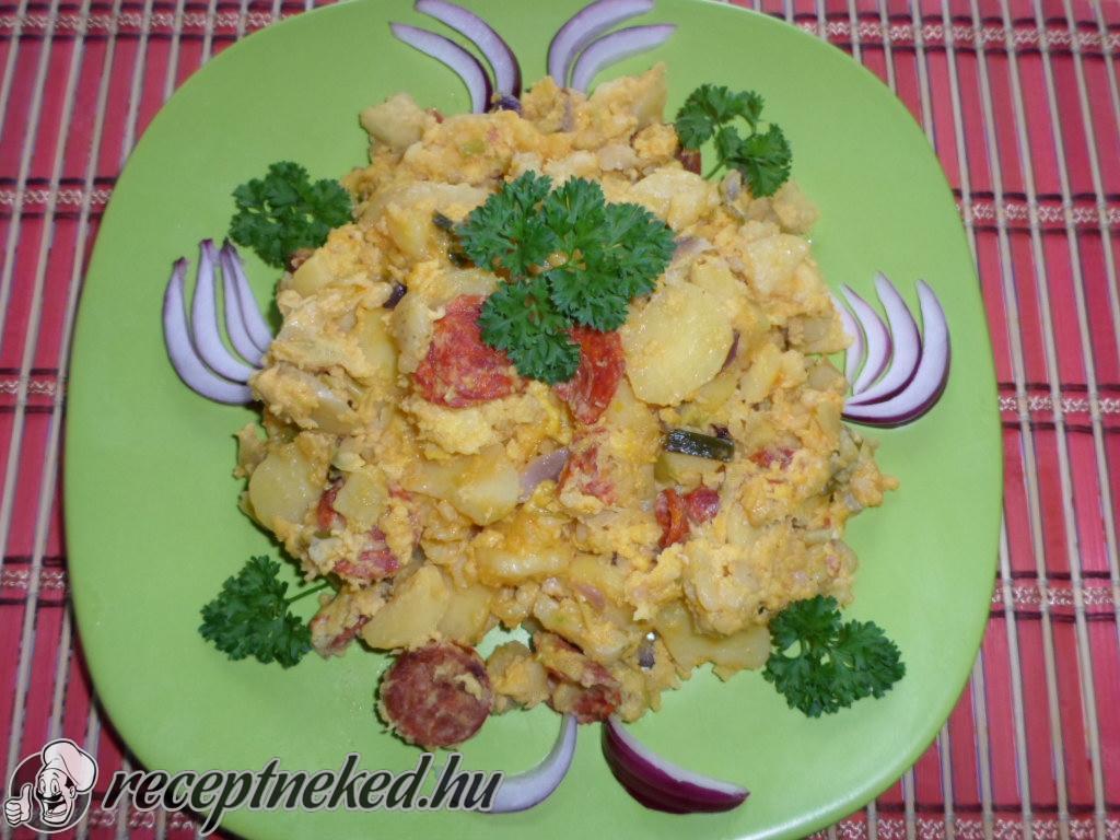 A tojásokat felverjük, cseppet meghintjük sóval és az ételre öntjük, majd készre sütjük.