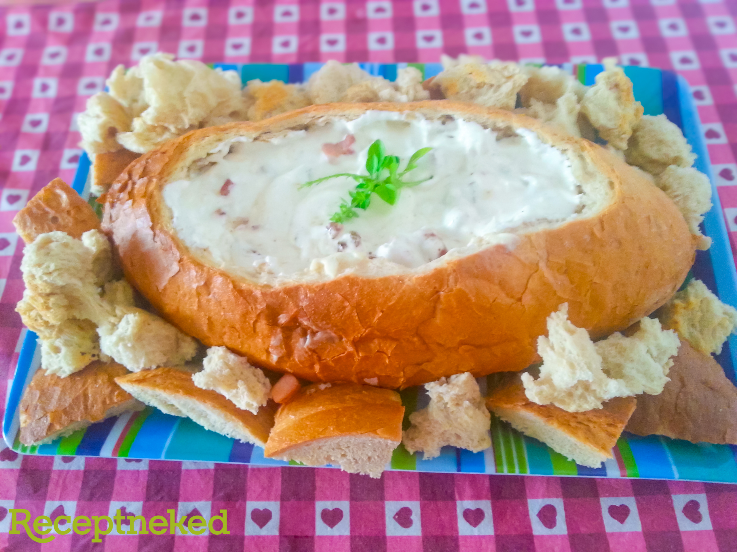 A tejfölt és a krémsajtot simára keverjük, majd ízlés szerint sózzuk. A keveréket a kenyér belsejébe öntjük.