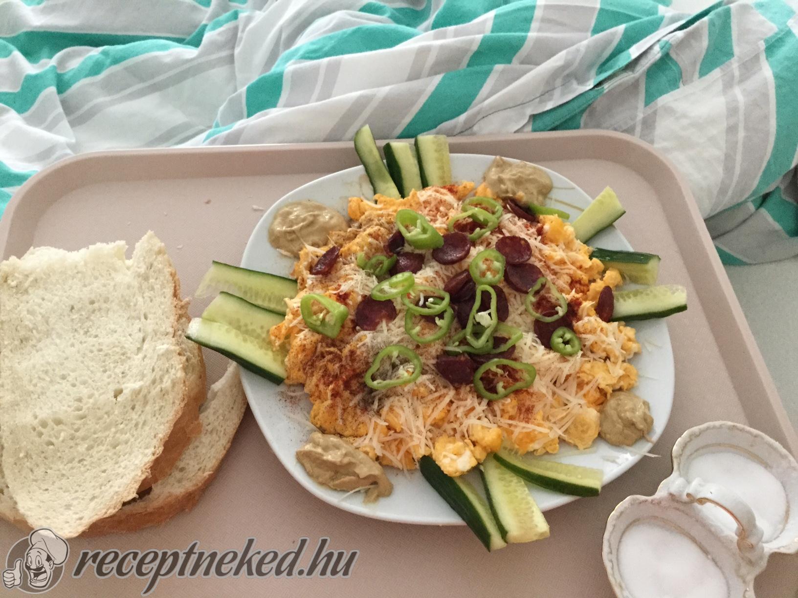 Közben a tojásokat felütjük egy tálba. Kevés sóval és borssal ízesítjük, majd a már megdinsztelt hagymára öntjük. Sütés közben többször átkeverjük. Ízlés szerint lágyabbra vagy keményebbre sütjük.