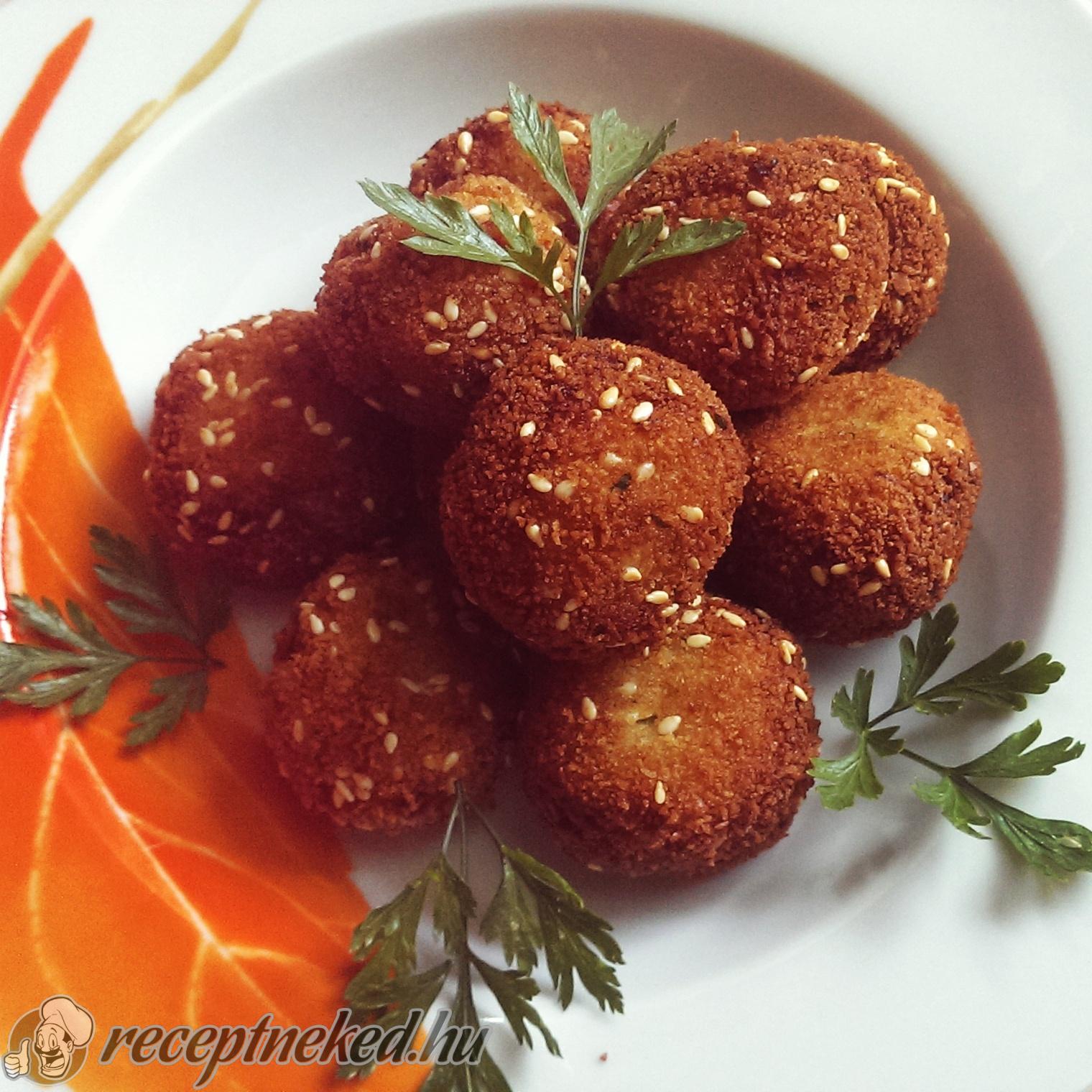Zsemlemorzsába keverjük bele a szezámmagot, és ebben hempergessük meg a golyókat, majd forró olajban közepes lángon világosbarnára sütjük.
