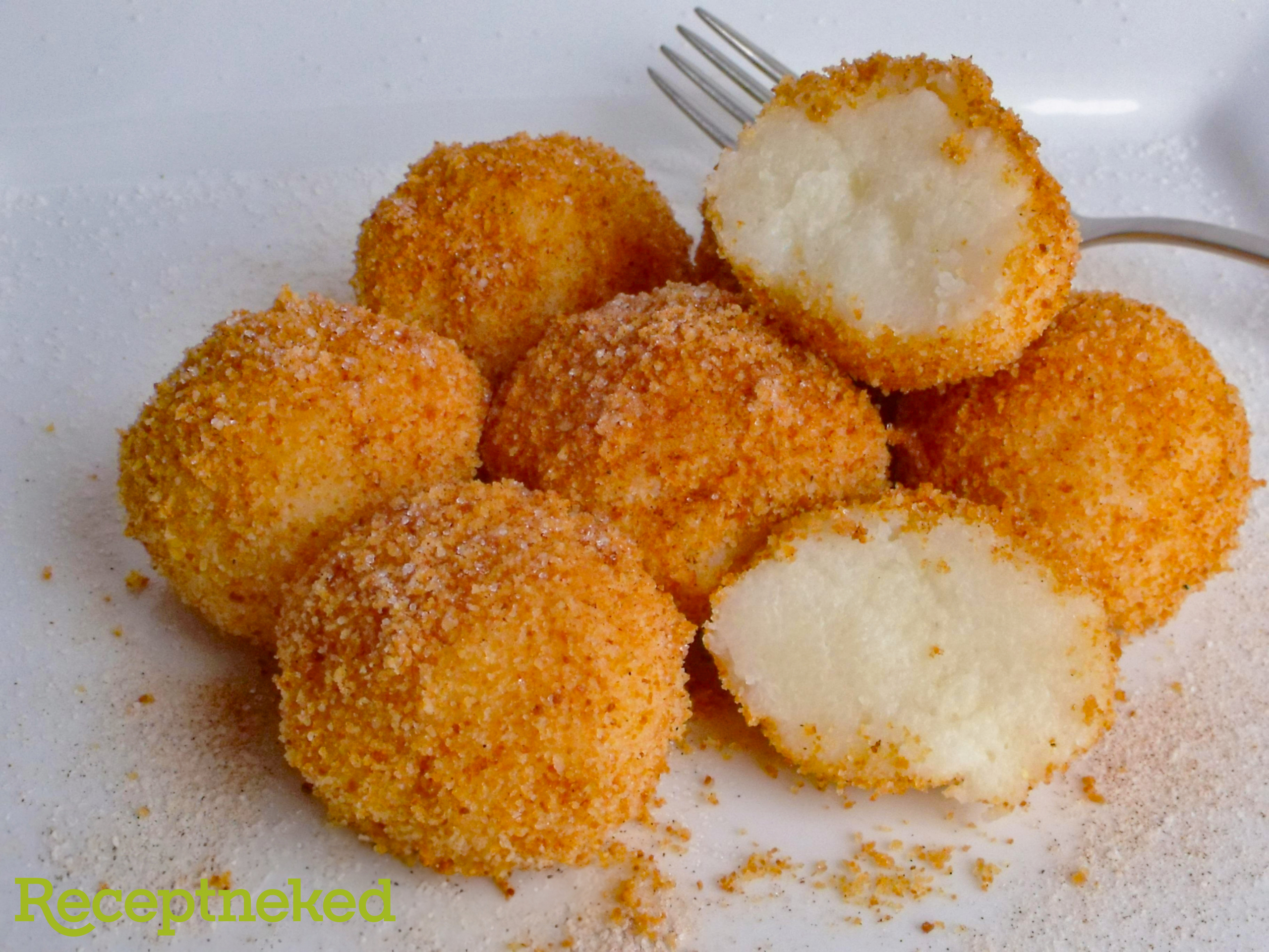 A kihűlt és kemény tejbegrízből vizes kézzel gombócokat formázunk, majd a pirított morzsában meghempergetjük.
