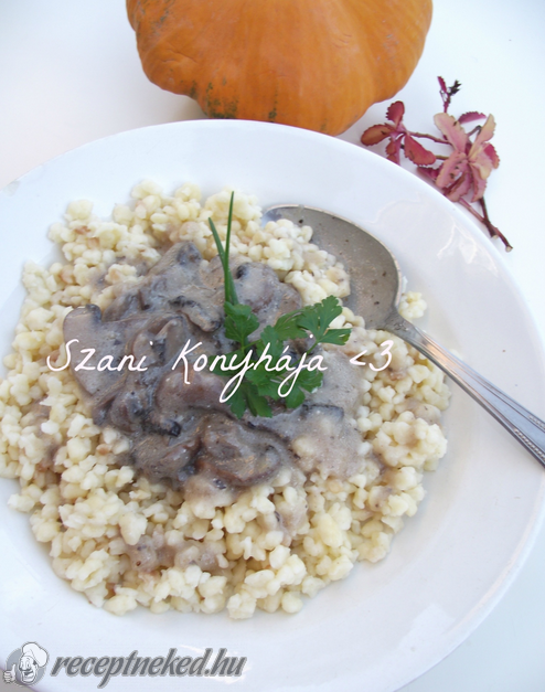 Ezután rádobjuk a gombát, egy kevés, szinte késhegynyi pirospaprikát hintünk rá a színe miatt, majd kevés vízzel felöntjük, borsozzuk, szórunk bele kevés majoránnát és puhára főzzük. Hozzáadjuk a tejfölt, majd kevés vízzel kevert lisztet vagy keményítőt is hozzákeverünk, hogy sűrűbb krémesebb szaftot kapjunk.