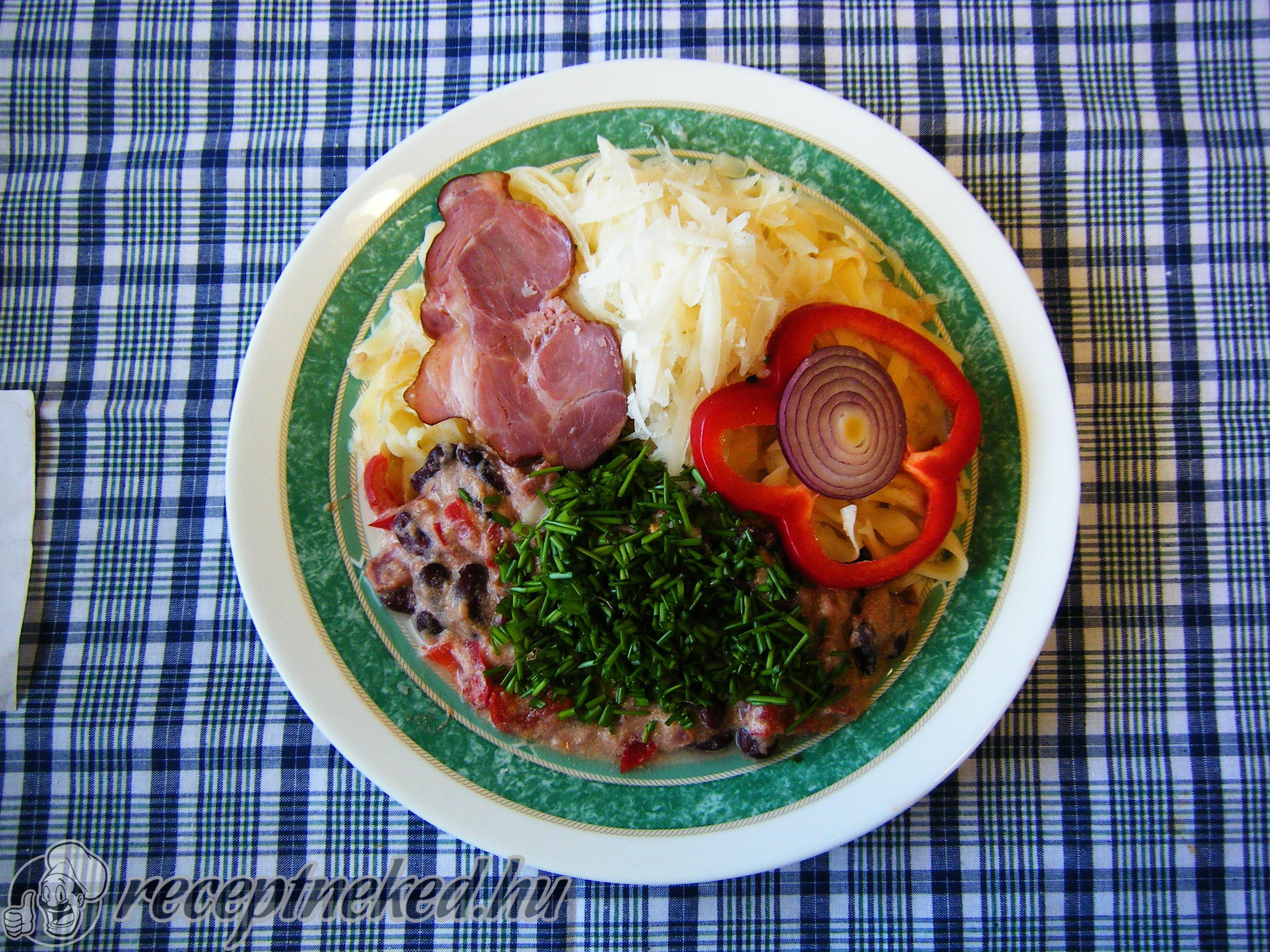 A tányérokon ízlésesen elrendezzük az ételt. Szórunk rá a sajtból, a snidlingből, majd teszünk rá paprikát és tarját is.