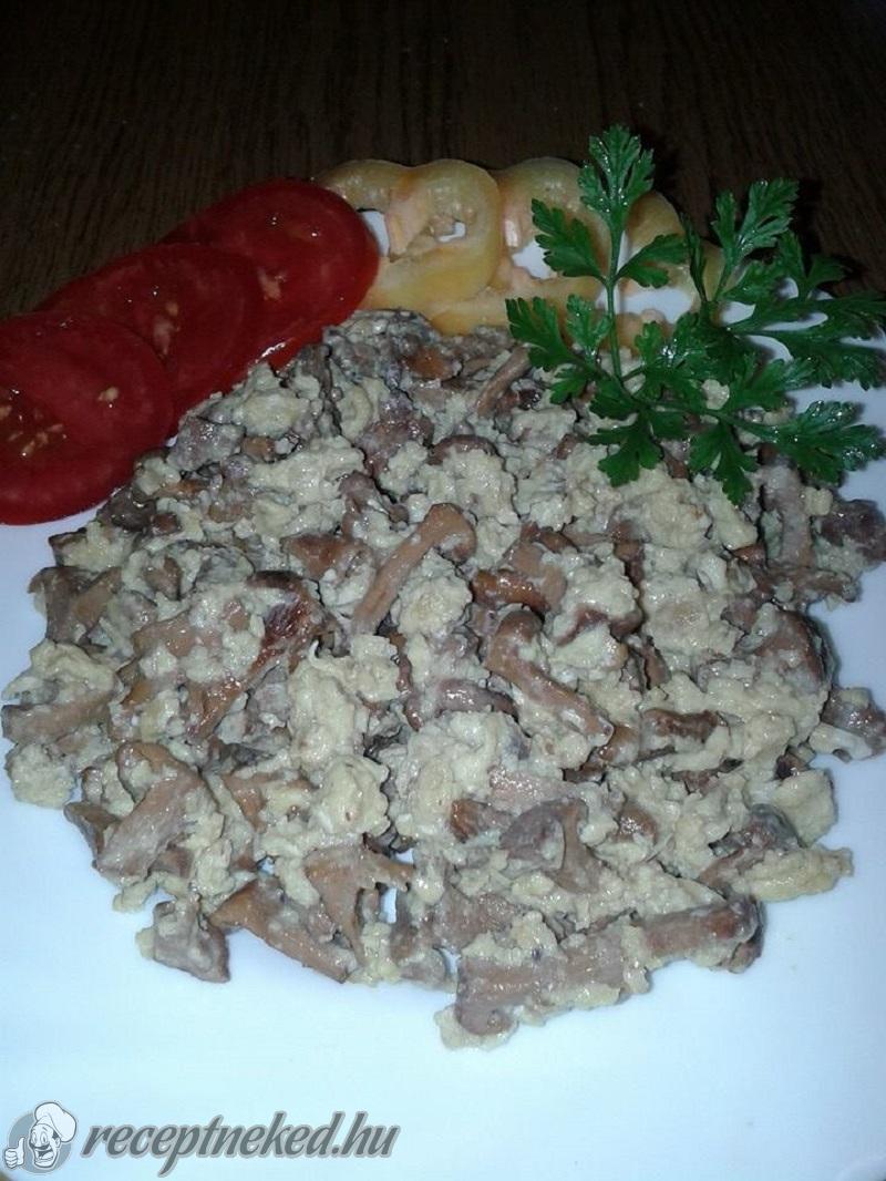 A tojást a sóval habosra verjük, ráöntjük a gombára, állandó kevergetés mellett 2 percig sütjük. Friss paradicsomsalátával tálaljuk.