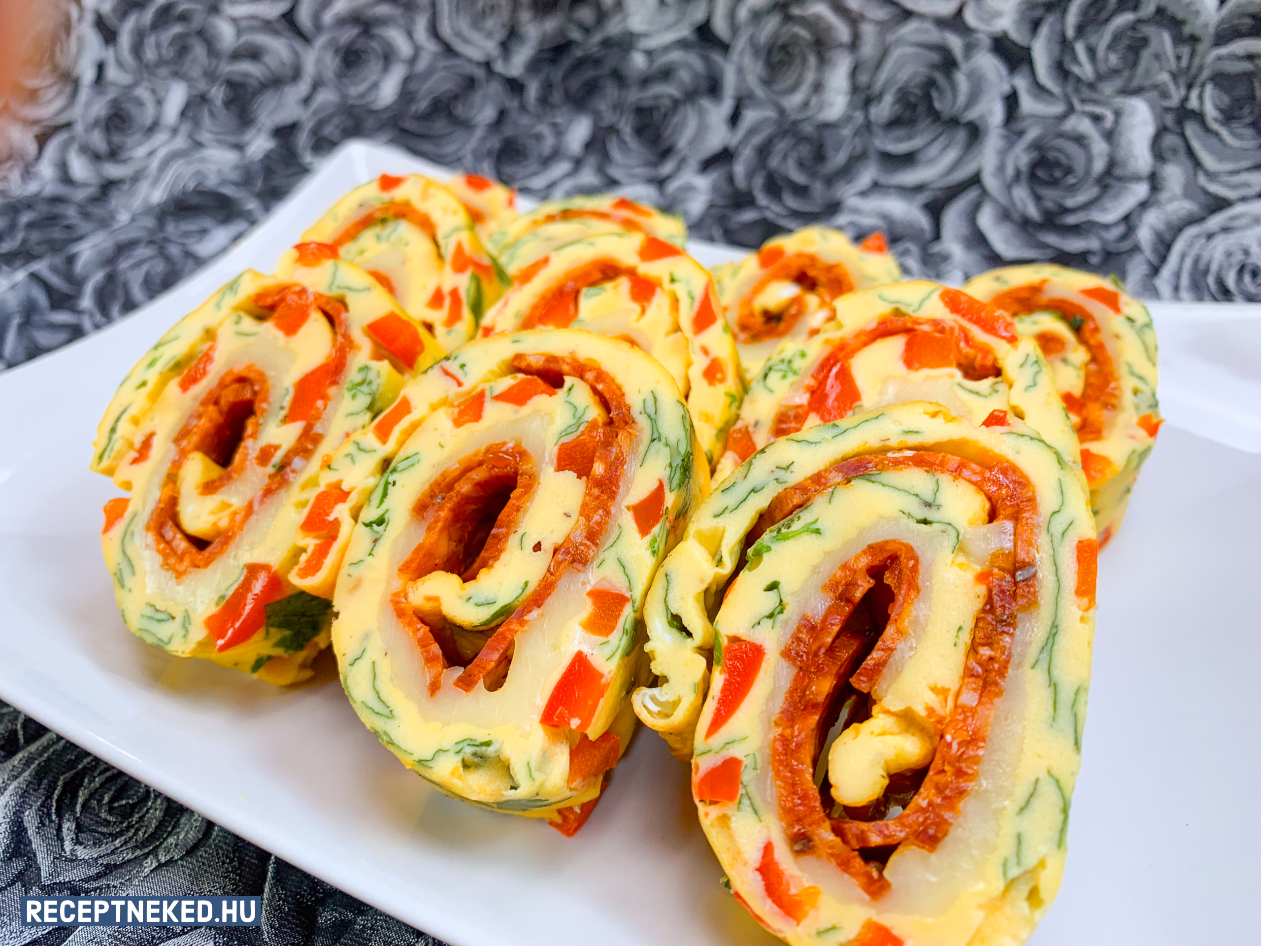 Még melegen vegyük ki a tepsiből és szórjuk rá a sajtot, majd tegyük ki szalámival és tekerjük fel.