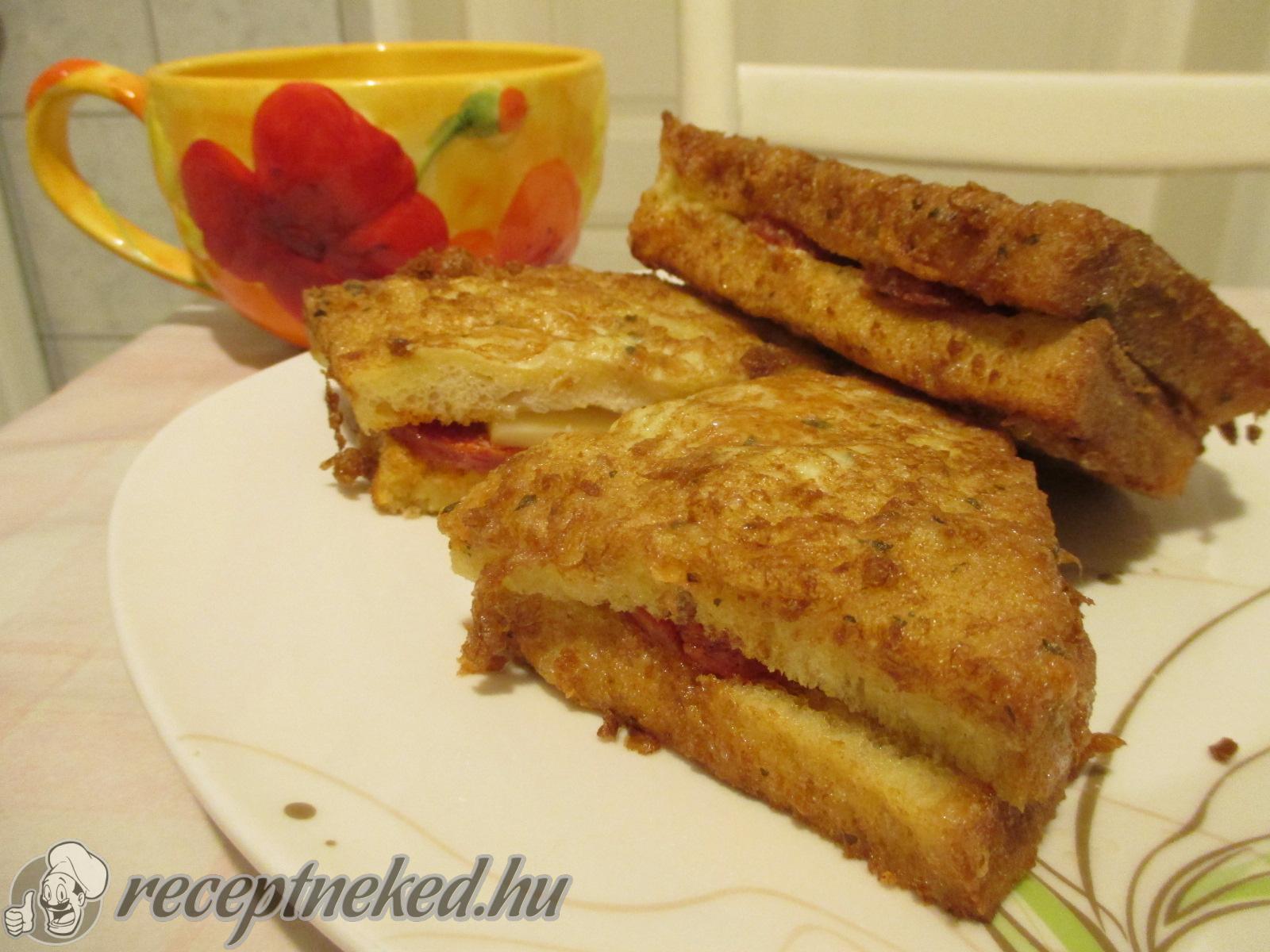 A fogvájóval rögzített szendvicseket óvatosan megfogjuk és mindkét oldalát megmártjuk a sajtos-petrezselymes tojásban, majd forró olajban közepes lángon egy-egy perc alatt mindkét felét aranybarnára sütjük, közben egyszer megfordítva. Én erre egy grill húsforgató csipeszt használok, azzal a legegyszerűbb. Kiszedés után hamar szedjük ki belőle a fogvájókat!