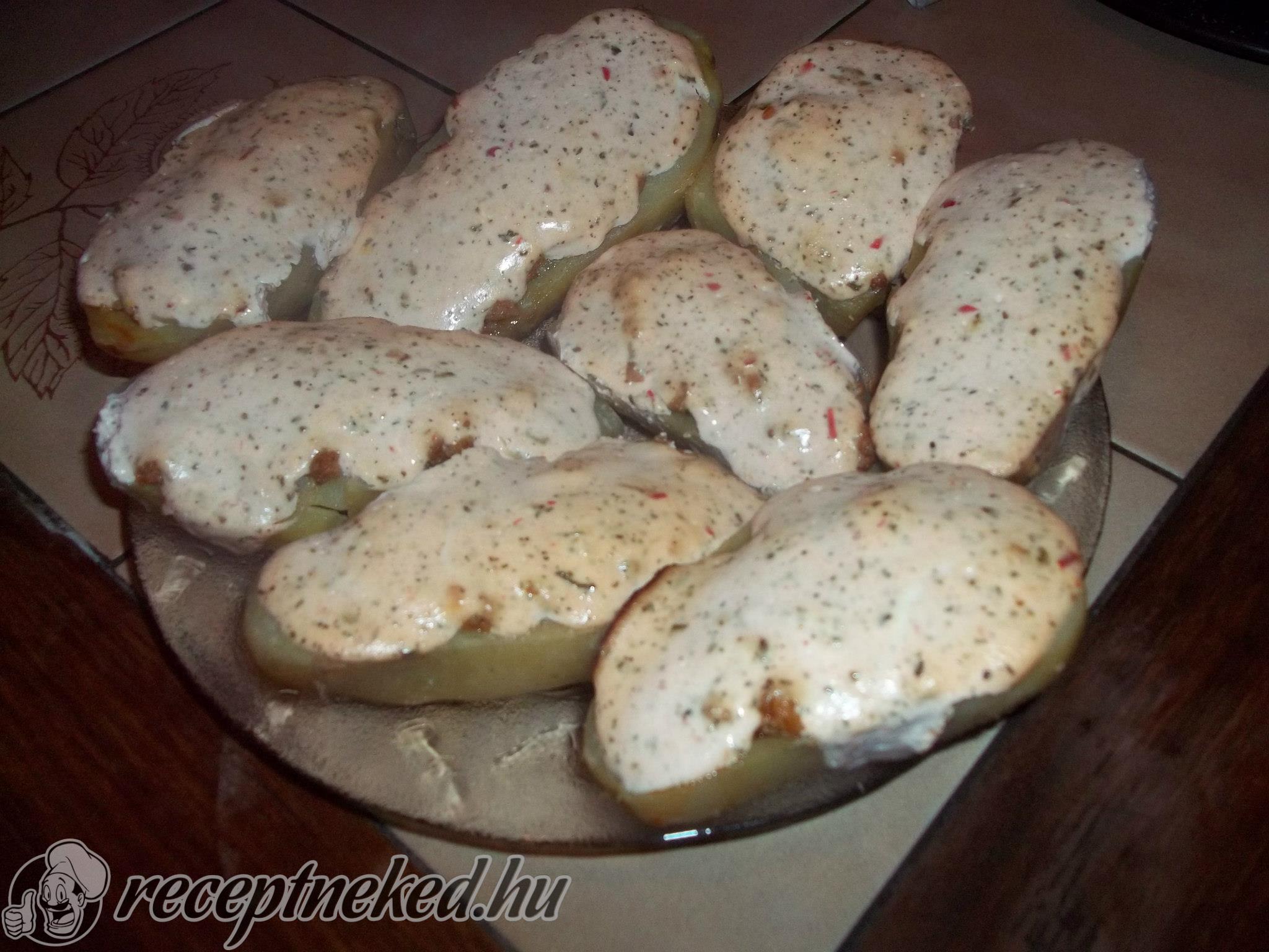 A kész darált húsos tölteléket a félbevágott burgonyák belsejébe kanalazzuk.