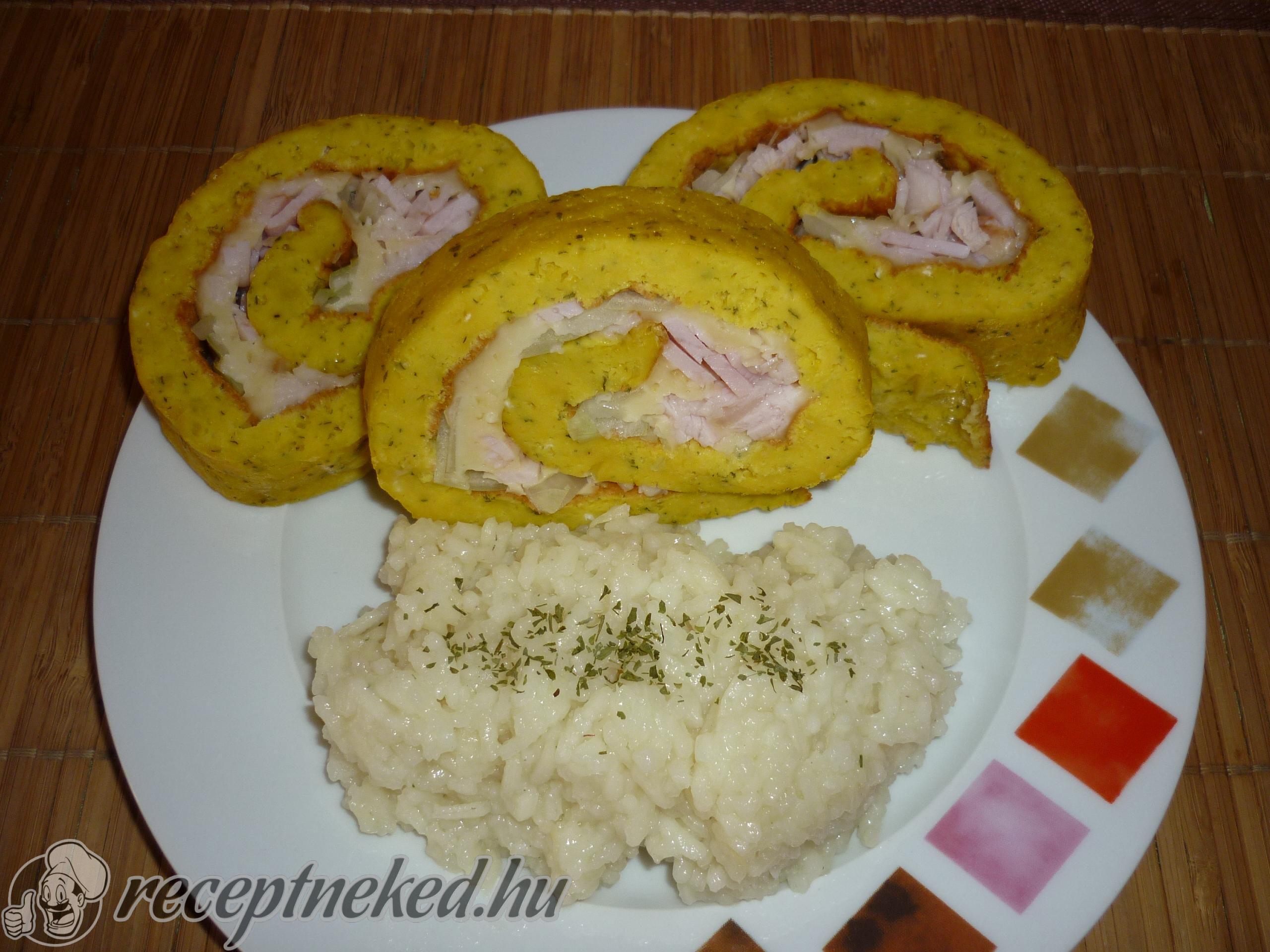 Amikor megsült a tojás, kivesszük a sütőből és gyorsan rászórjuk az apró kockákra vágott hagymát, sonkát és a reszelt sajtot. Szorosan feltekerjük. A kész tekercset hagyjuk kihűlni, majd felszeletelve tálaljuk.
