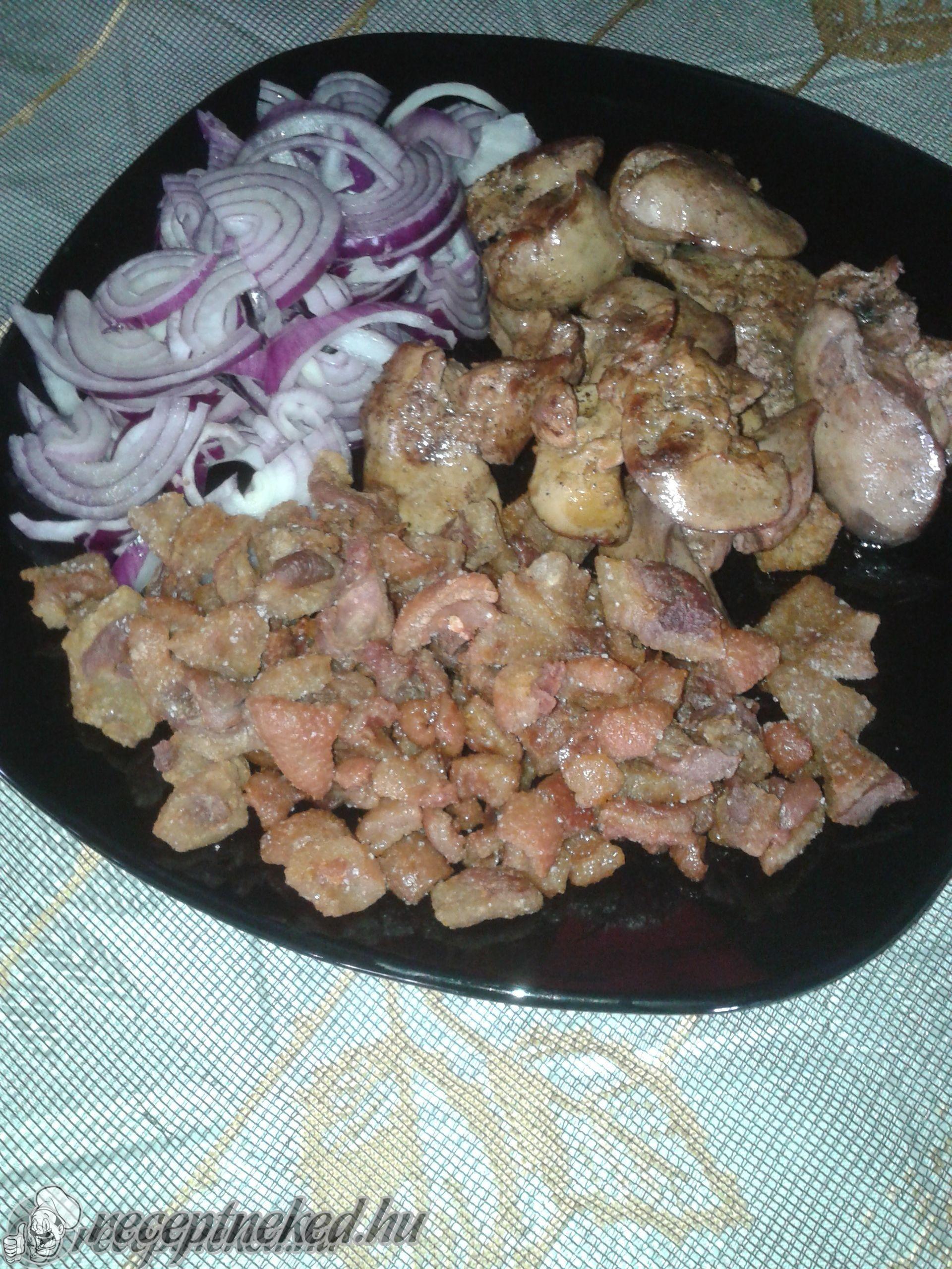 Most már csak annyi dolgunk van, hogy néhány lilahagymát és friss, ropogós kenyeret felszeleteljük és jó étvággyal megegyük. A máj sütése után visszamaradt zsír nagyon jó tunkoláshoz.