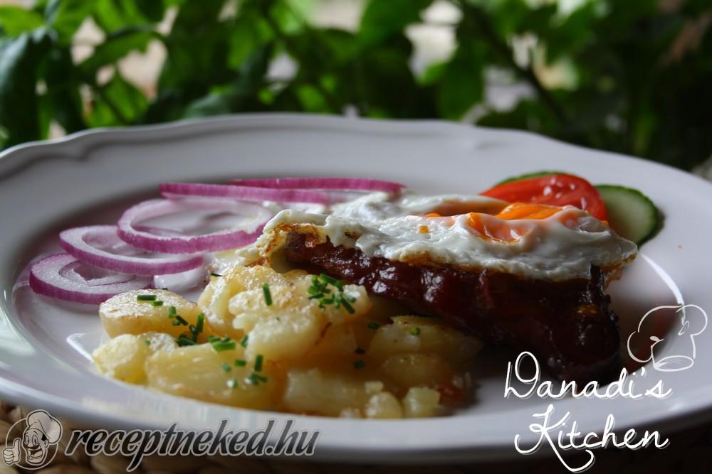 A felforrósított serpenyőben zsírjára sütjük a bacon szeleteket. A virslit meggrillezzük a serpenyőben, miután kész a szalonna, ha kell pótlunk még rá zsiradékot. Miután a virsli elkészül, tükörtojást készítünk.