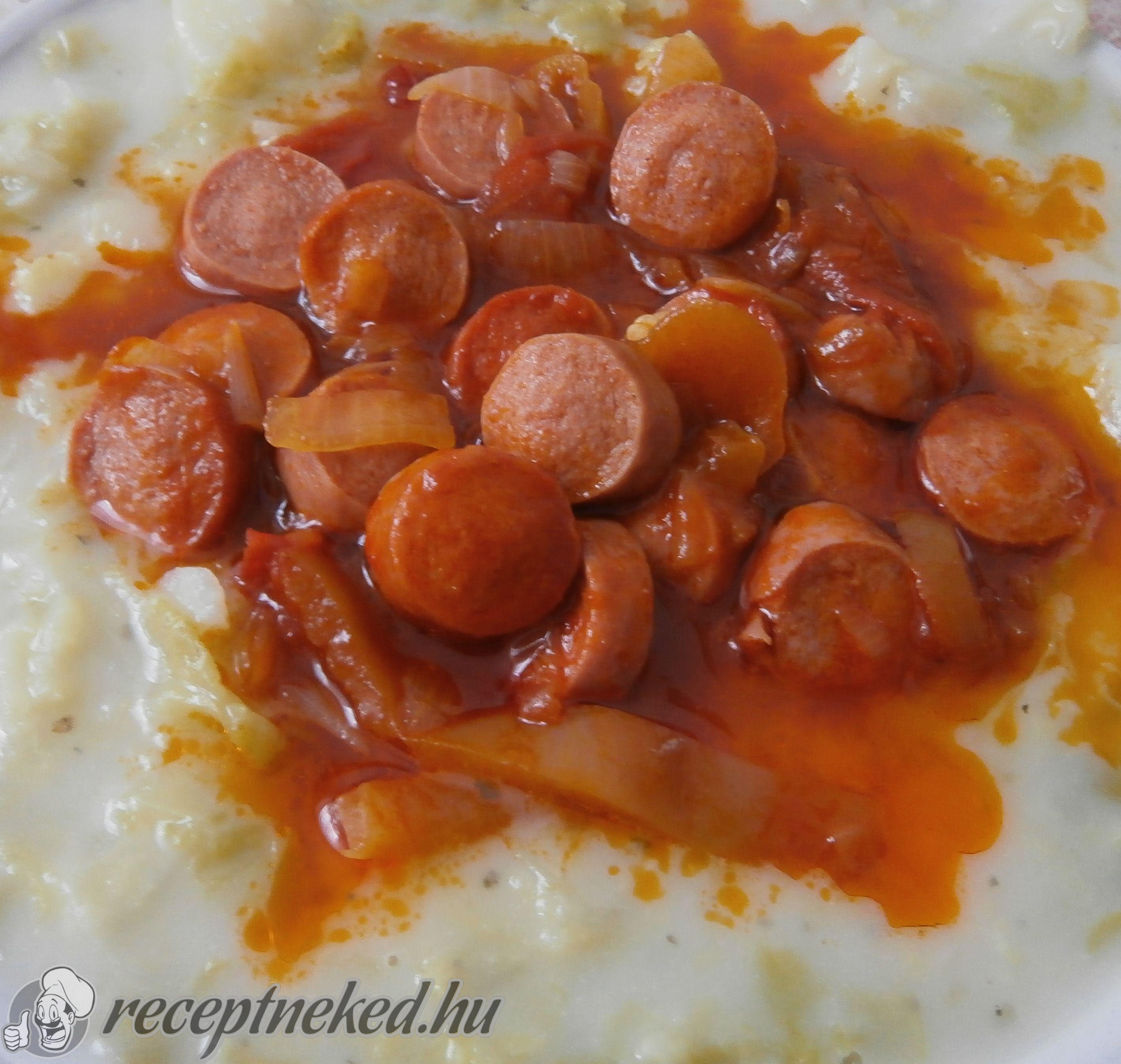 A vöröshagymát apróra vágom és megfonnyasztom az étolajon, megszórom pirospaprikával. A virslit karikázom és hozzáadom.