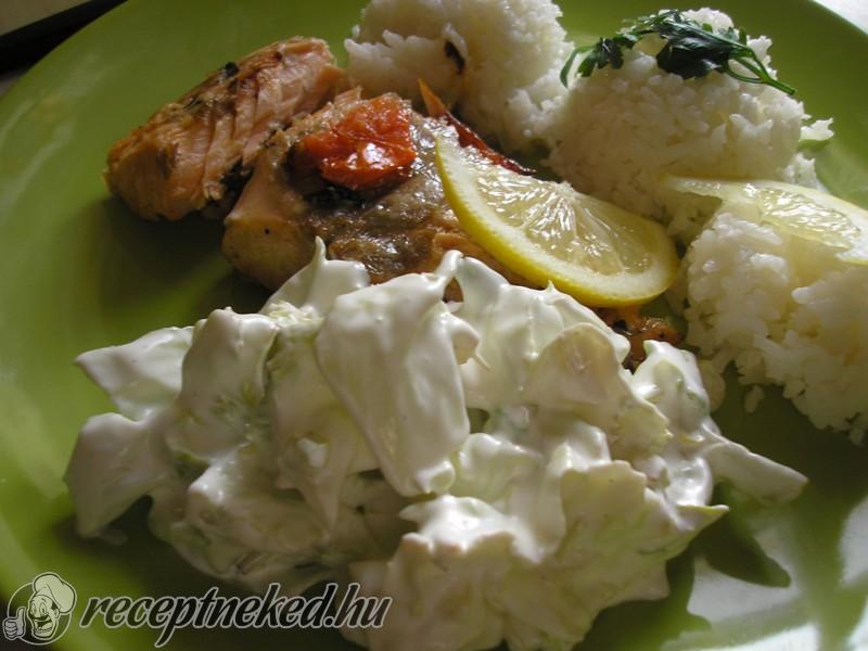A salátát megmossuk, megszáírjuk és apróra vágjuk az újhagymával együtt. A majonézt összekeverjük a tejföllel, mustárral és ízlés szerinti mennyiségű sóval, borssal és a citrom levével. A hagymás és a salátát beleforgatjuk, majd a hallal tálaljuk.