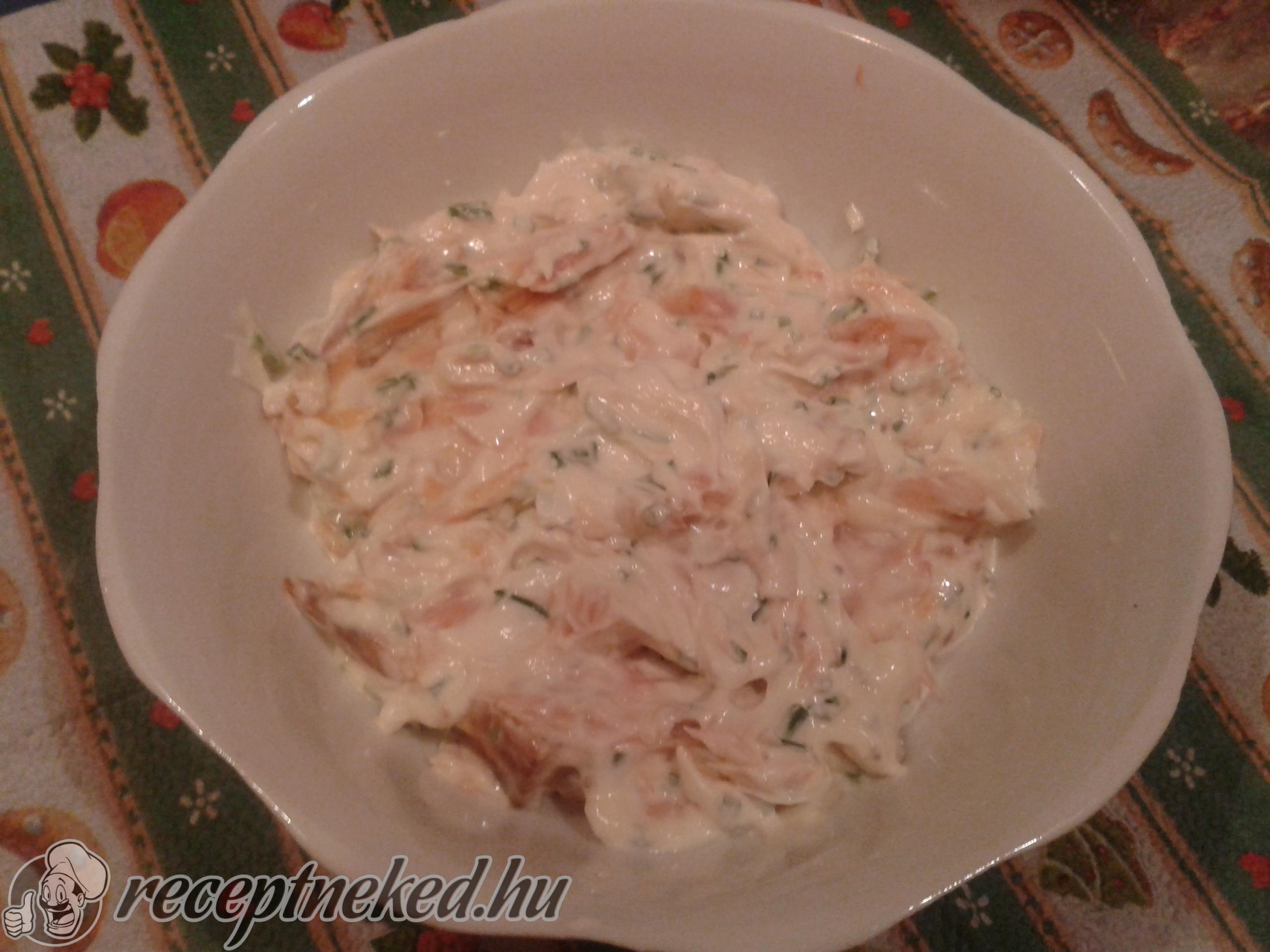 A lazac szelteket csíkokra vágjuk és feltekerjük, majd elhelyezzük a tálon a tojásokkal együtt. Végezetül meghintjük friss kaporral.