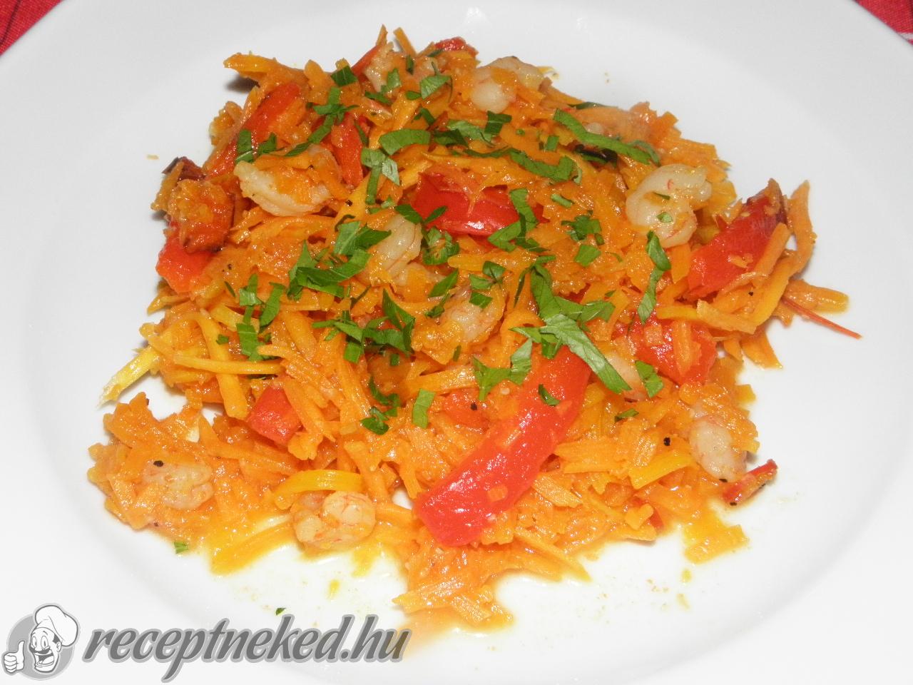 Egy serpenyőben olajat hevítünk. Rádobjuk a paprikát és jól lepirítjuk. Hozzáadjuk a zúzott fokhagymát, a csilipelyhet, és néhány másodpercig kevergetve pirítjuk. Hozzáadjuk a garnélarákot. Sóval, borssal ízesítjük és néhány percet pirítjuk.