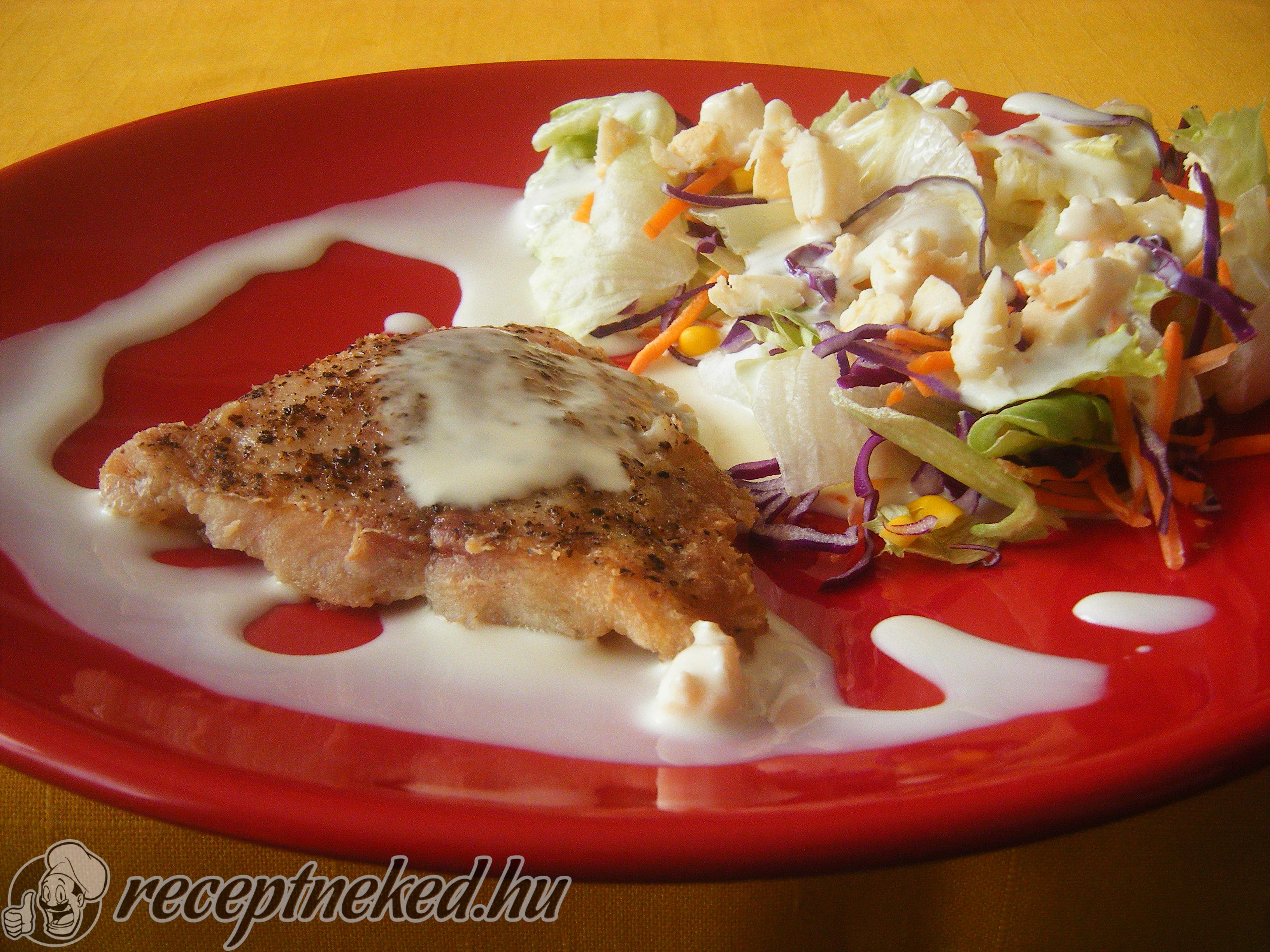 A halat besózzuk borsozzuk és félre tesszük, míg a salátát elkészítjük. A sajtot egy edénybe tesszük, apróra feldaraboljuk, majd a saláta keveréket hozzá adjuk, ráöntjük az olajt, ecetet és a tejszínt ezután alaposan összeforgatjuk. Fél órára hűtőbe tesszük.