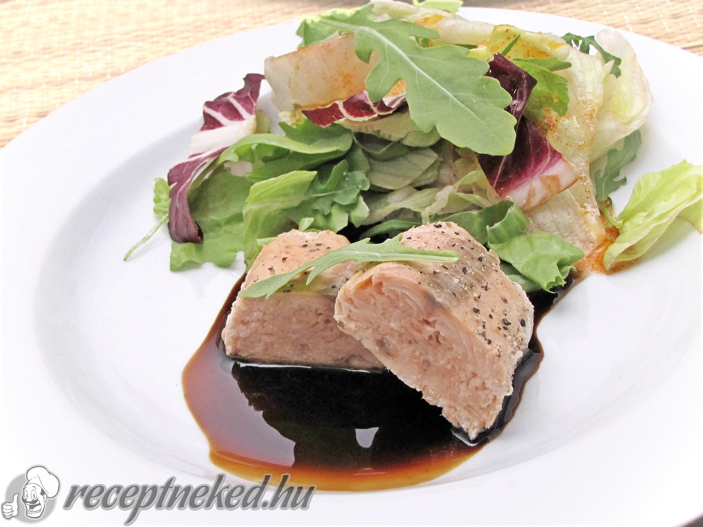 A saláta keveréket az elkészített muzsdéllyal és kevés tárkonyecettel öntözzük meg, valamint újhagyma karikákat vághatunk rá.