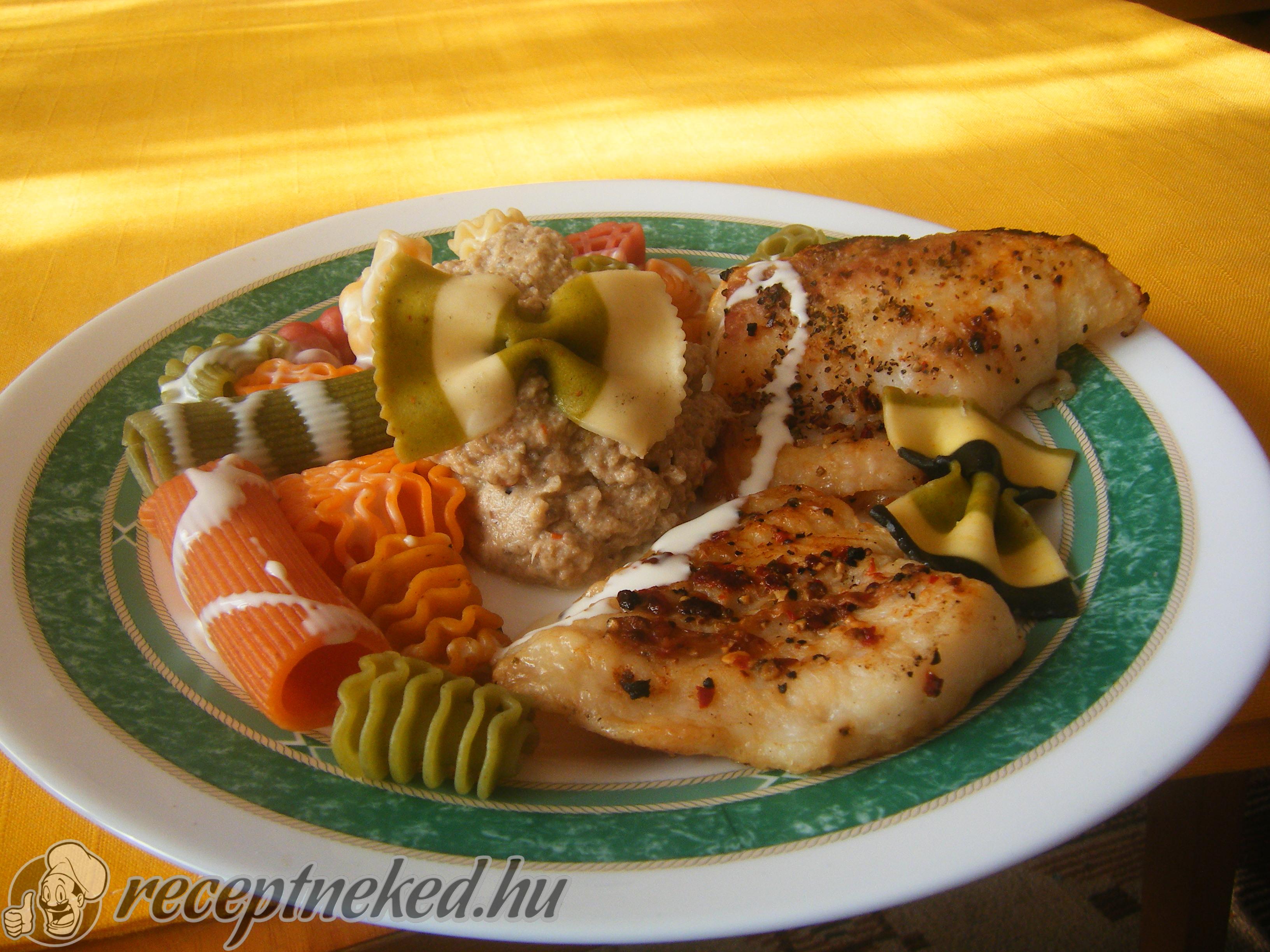 [box style=”info”]A tésztát az egy baráti családtól kaptam. A tészták színezése nem mesterséges színező anyaggal van megoldva, hanem növényekből kivont festékkel(spenót, cékla,sárgarépa stb). Aki csak megkóstolta, mindenki dicsérte ezt a kreációt.[/box]