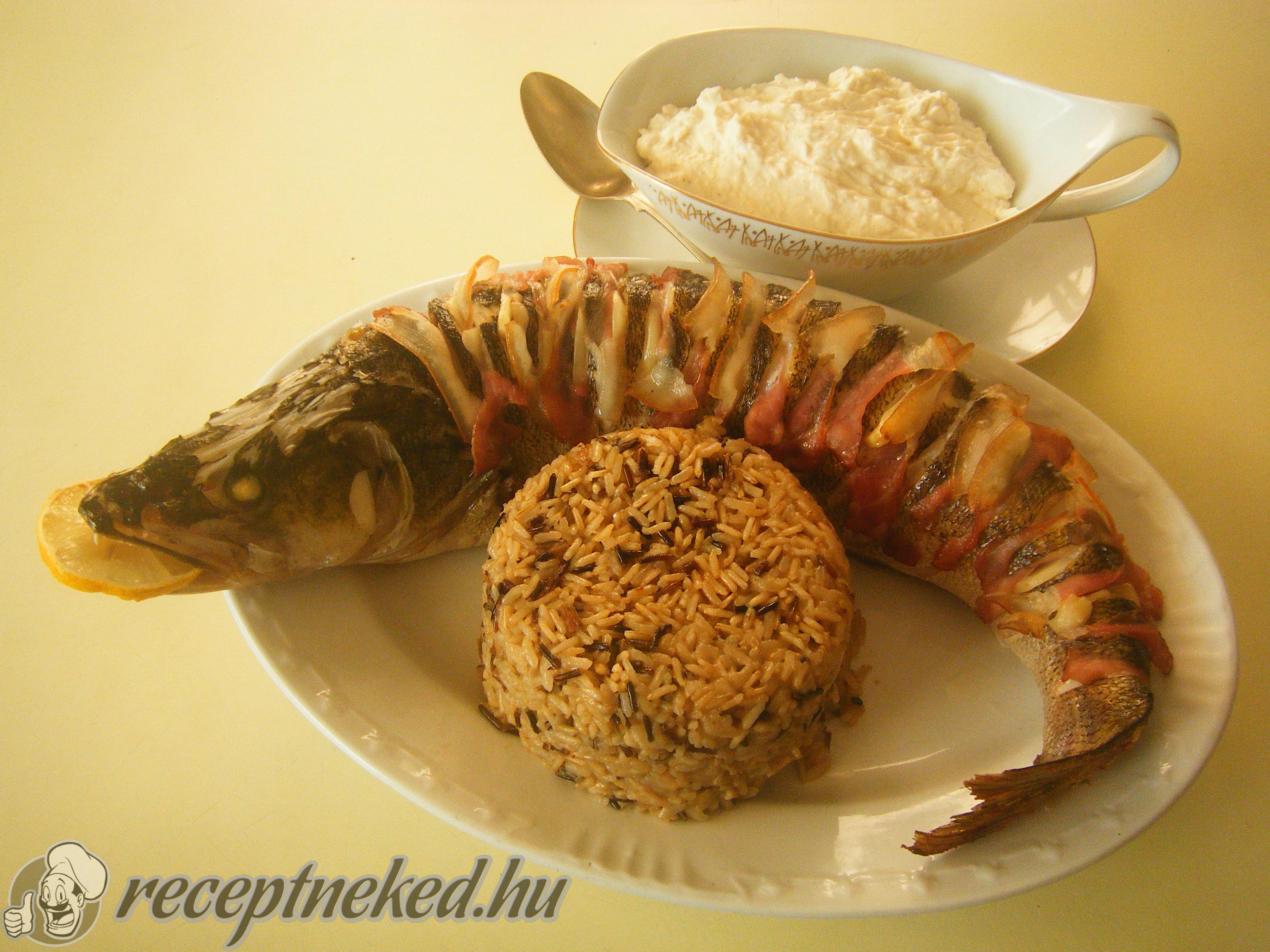 A fokhagymát megtisztítjuk és hosszanti irányban vékonyra felszeleteljük. A sonkát a hal átmérőjének megfelelően eldaraboljuk és hosszanti irányba középen behasítjuk. Így könnyebben tudjuk a hal gerincéhez odailleszteni. Minden kereszt alakú nyílásba beillesztünk egy szelet sonkát és egy szelet fokhagymát.