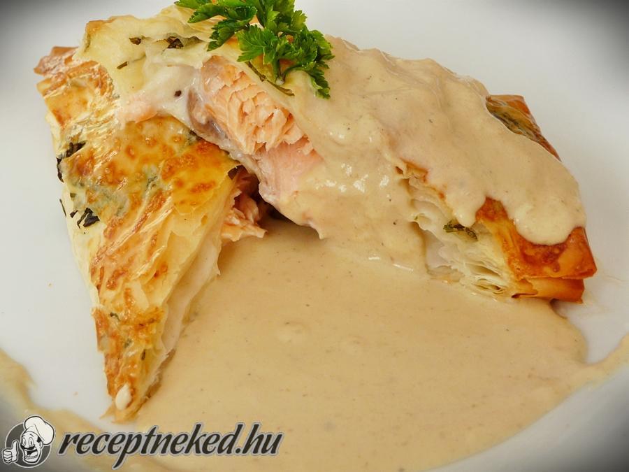 Nedves konyharuhára teszünk egy réteslapot és éles késsel félbevágjuk, majd az egyik lapot lekenjük az olvasztott vajjal. Megszórjuk az apróra vágott petrezselyemzölddel és ráhelyezzük a megmaradt fél réteslapot. Ezután ráhelyezünk egy fűszerezett lazaccsíkot, majd a tetejére kanalazunk a tejszínes-tormából. Ezután ráhajtjuk jobb oldalról a réteslapot, majd bal oldalról is, hogy befedje a halat. Végül óvatosan feltekerjük, mint a rétest (minden lazaccsíkkal így járunk el).