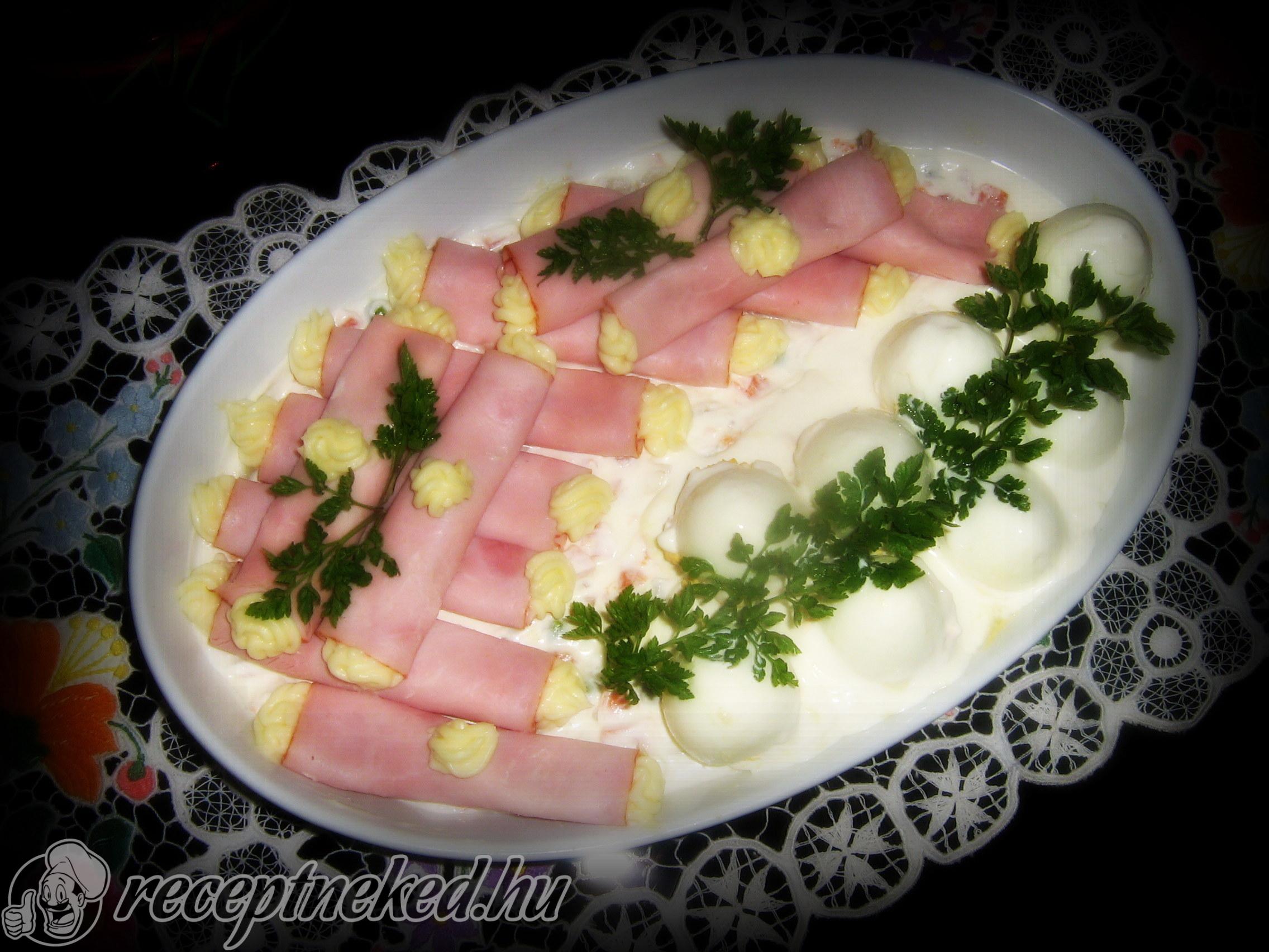 A tojáskrémet visszatöltjük a tojásfehérjék üregébe és a töltött felükkel lefelé a franciasalátára rakosgatjuk őket, majd a maradék 1/3-ad tartármártást vékony sugárban rájuk csorgatjuk, úgy, hogy mindenütt befedje.
