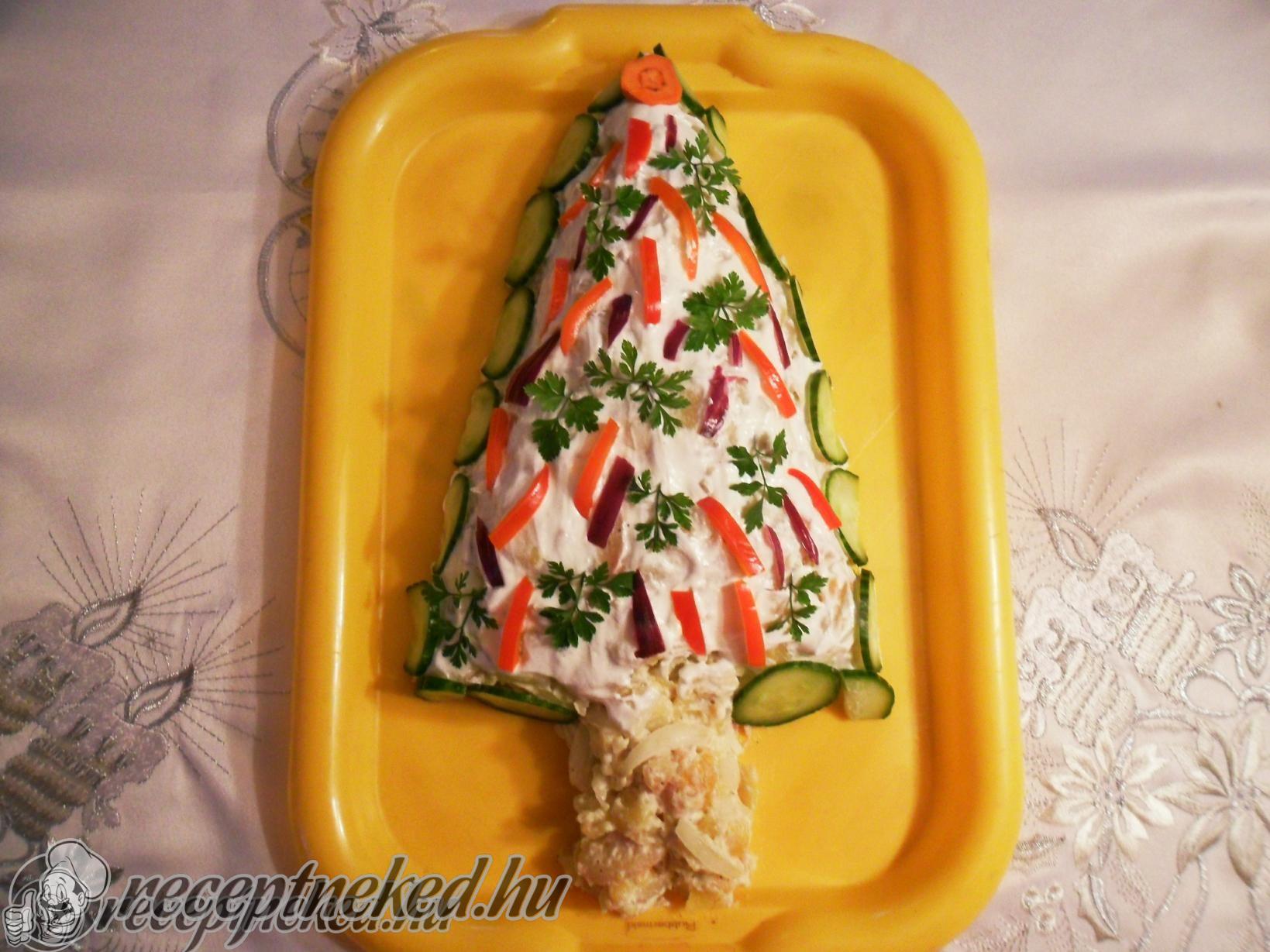 Egy tálcára halmozzuk, fenyőfa alakot formázunk belőle. Vékony réteg tejföllel bekenjük. Körben kirakjuk karikára szeletelt uborkával. Ízlés szerint díszítjük vékony csíkokra vágott piros paprikával, lilahagymával és petrezselyemzölddel.