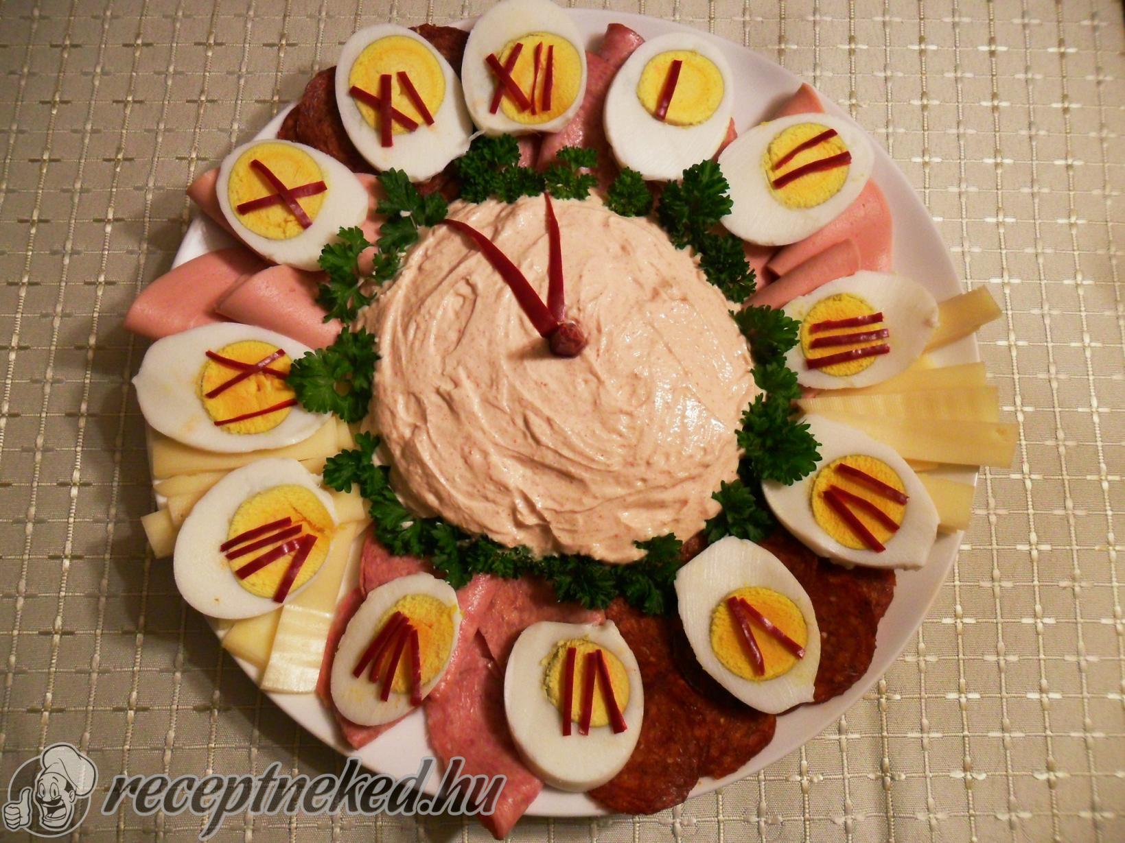 A sajtot csíkokra vágjuk, a szalámit, párizsit és egyéb felvágottakat felszeleteljük, majd felváltva a túrókrém köré rendezzük. A főtt tojásokat felszeleteljük, és a felvágottak köré helyezzük, mintha az óra számlapját alkotnák.