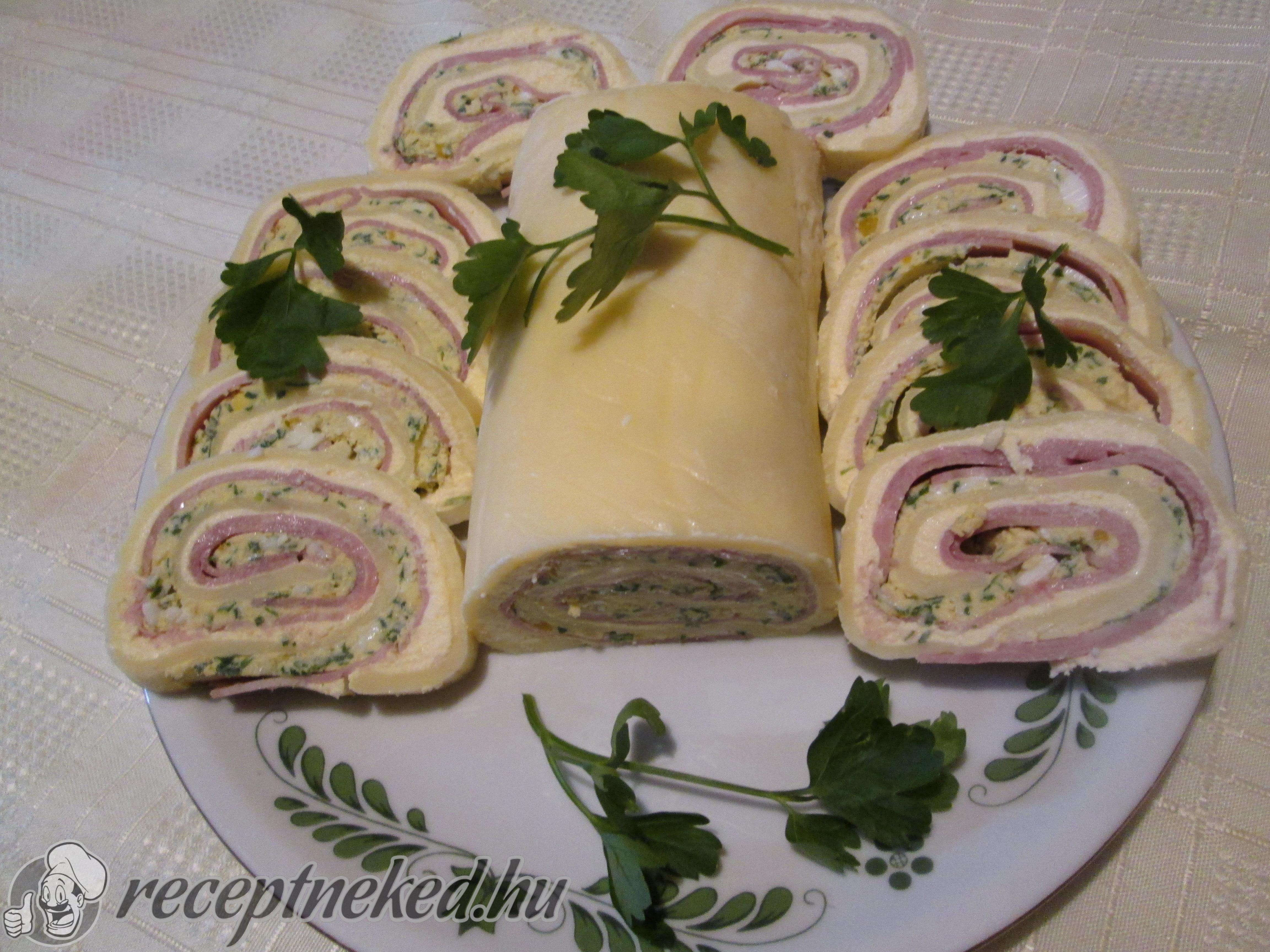 Rákenjük az első krémet (margarin-sajt), ezt befedjük a kocka sonkával, erre kenjük a második krémet(margarin-tojás-petrezselyem), majd feltekerjük.