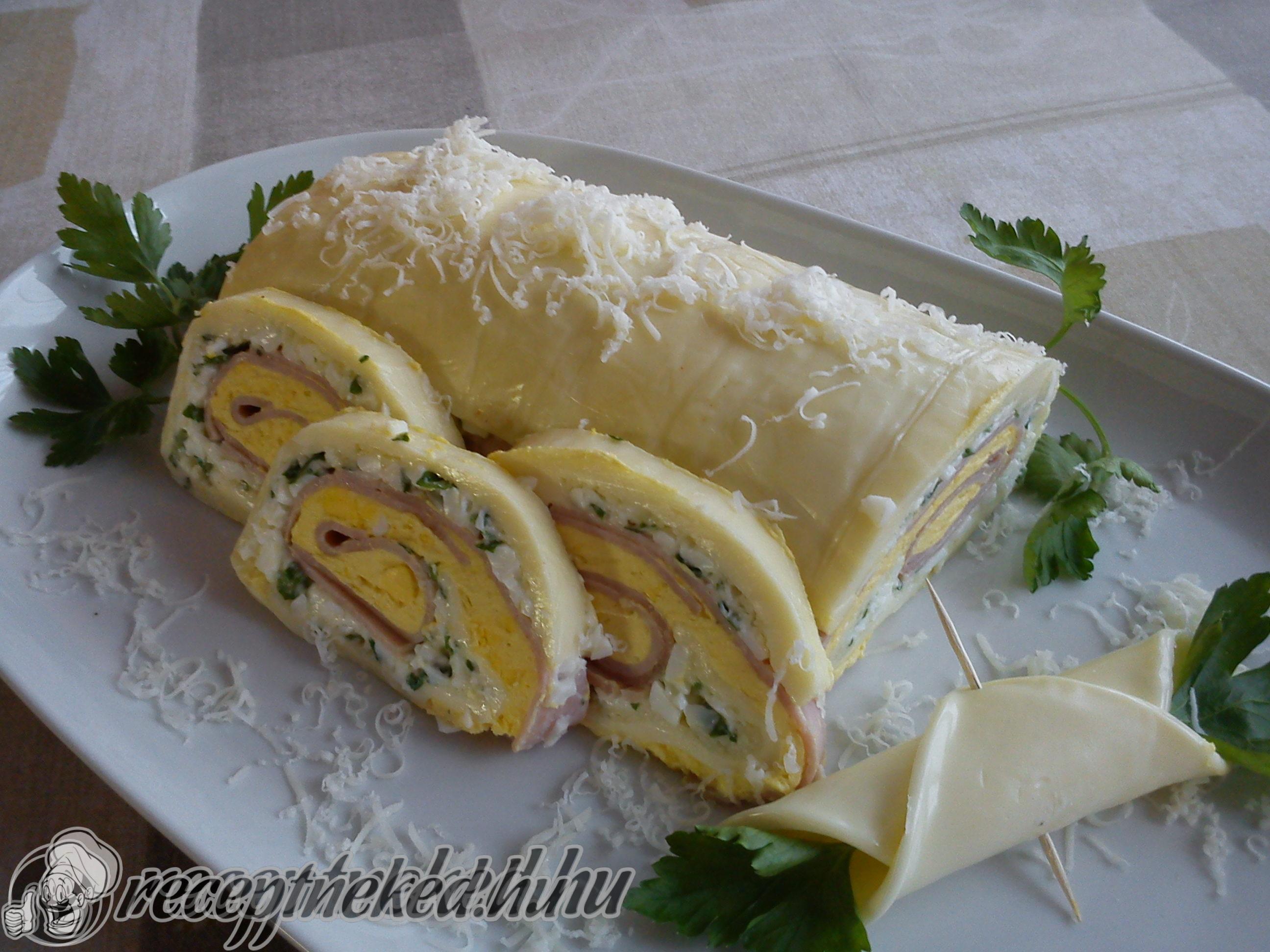 A sajtlapokra először a tojásfehérjés-sajtos krémet kenjük, erre fektetjük a sonkaszeleteket, majd a tojássárgás krémet simítjuk a tetejére. Az egészet óvatosan feltekerjük, fóliába csomagolva hűtőbe tesszük, majd éles késsel szeleteljük. Pirítóssal vagy friss kenyérrel kínáljuk.