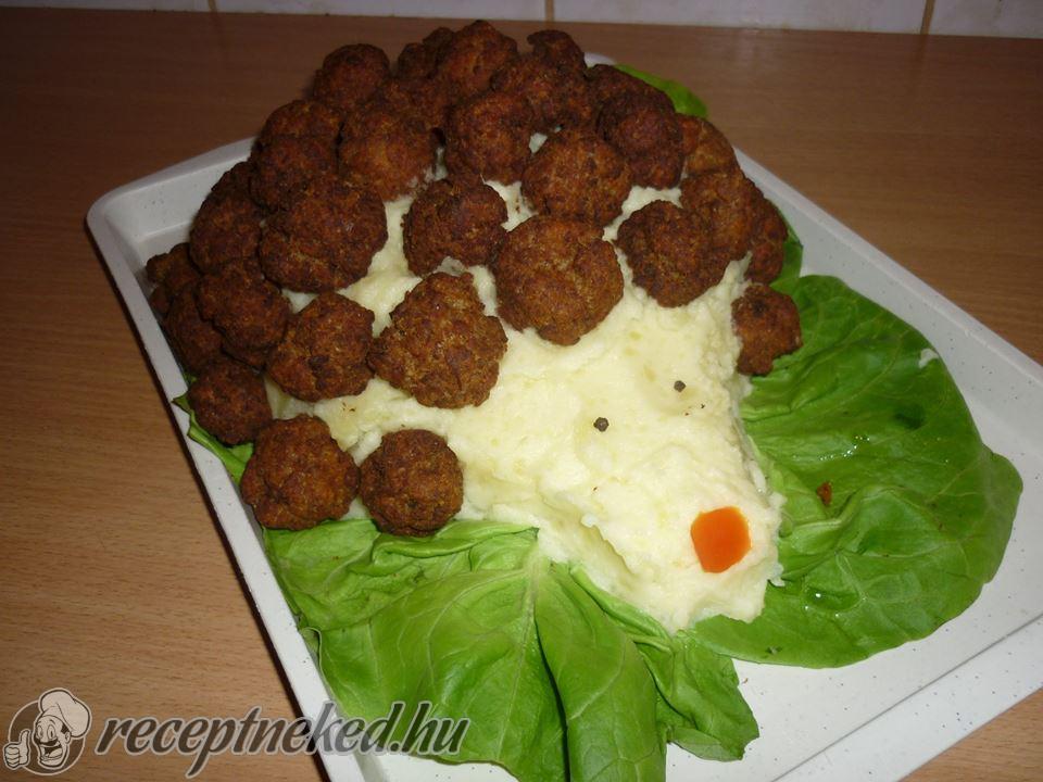 Ezután a fasírt golyókat rápakoljuk a burgonya alapra és kész is a süni.