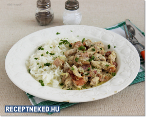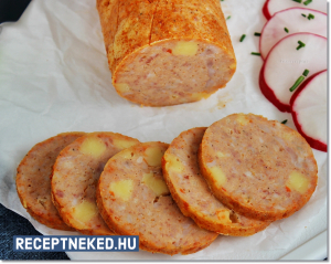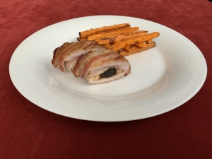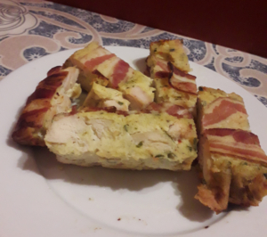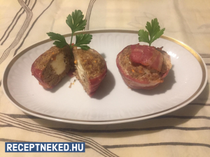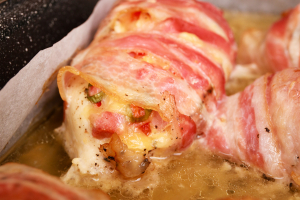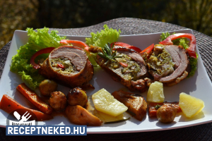 Aszalt szilvával, füstölt sajttal, sonkával töltött pulykamell baconbe tekerve