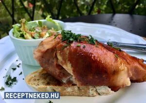 Alma-körte-dió töltelékkel készült baconos csirketekercs