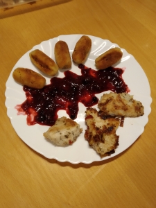 Fűszeres pulykamellszeletek túrórudacskákkal és gyümölcsmártással