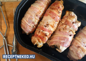 Alma-körte-dió töltelékkel készült baconos csirketekercs