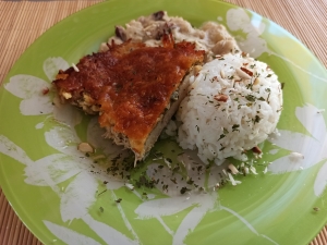 Pácolt pulykamell reszelt sajtban, gyümölcsraguval