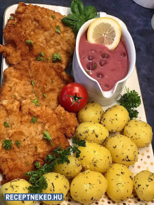 Rántott hús meggy mártással, petrezselymes újkrumplival