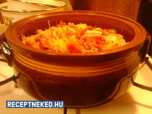 Kakaspörkölt savanyúkáposzta ágyon, cserépedényben