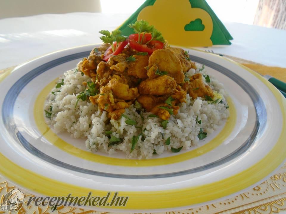 A karfiolt tartármártással és rizzsel tálaljuk.