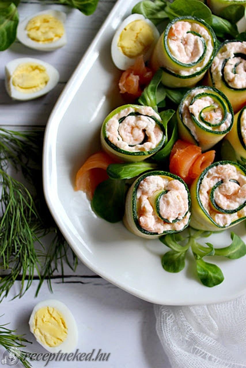 A cukkini szeleteket egyenként kiterítjük és megkenjük a lazacos krémmel. Szorosan feltekerjük.