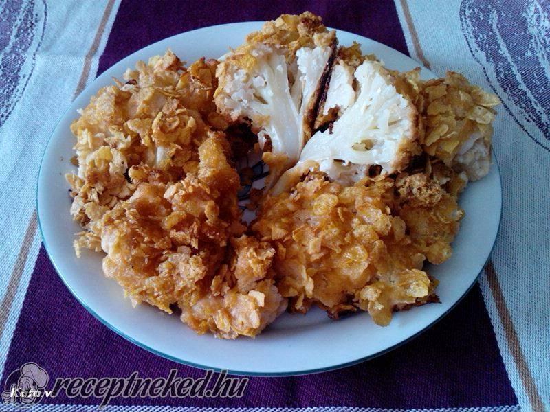 A joghurtot egy tálba öntjük, belekeverjük a zúzott fokhagymát. A karfiolokat egyenként belemártjuk a joghurtba, majd megforgatjuk a kukoricapehelyben.