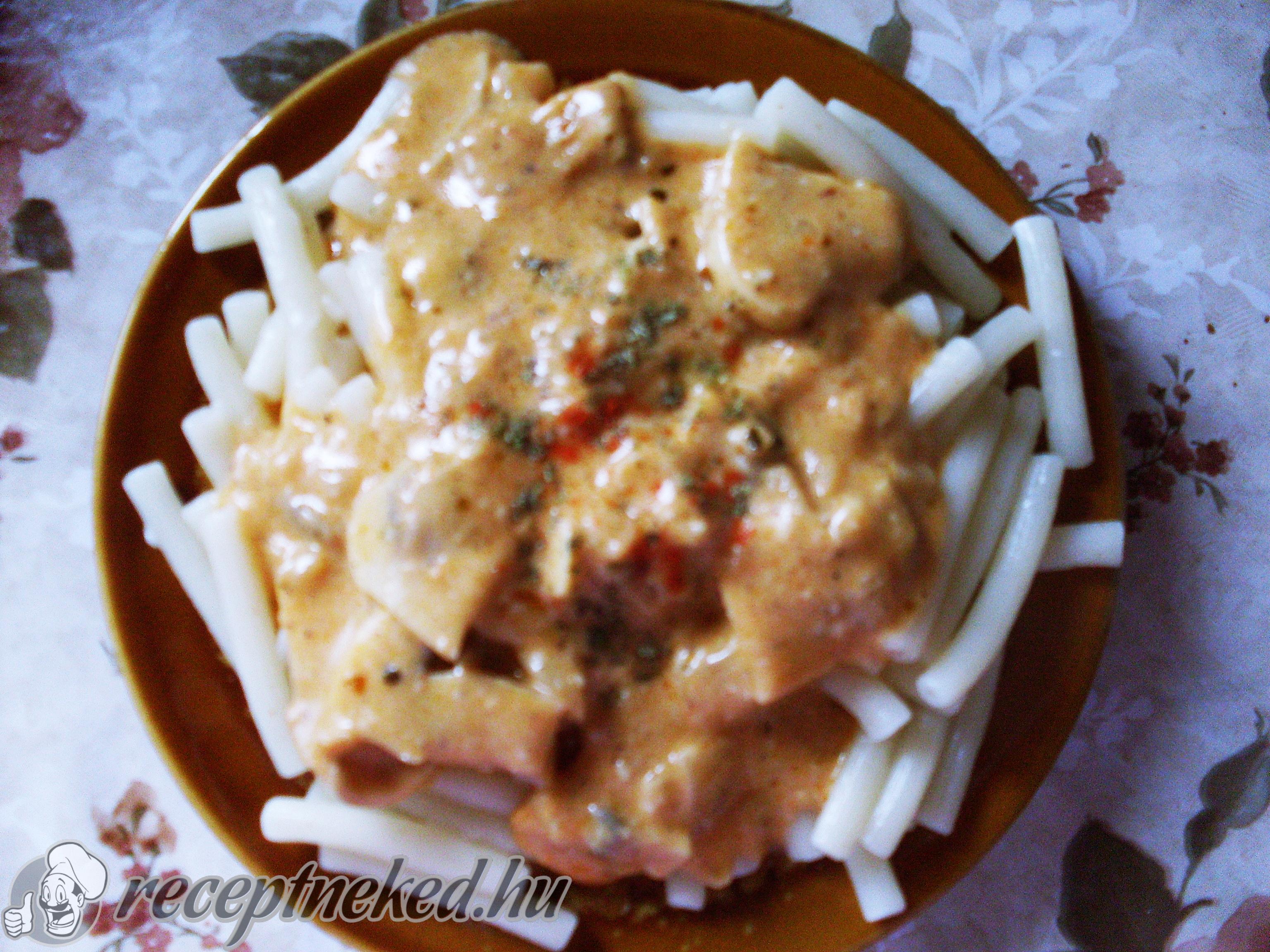 A tésztát sós, olajos, forró vízben készre főzzük. A vöröshagymát apró kockákra vágjuk, majd az olajban megpirítjuk, ügyelve, hogy ne égjen meg. Amikor kezd pirulni, hozzáadjuk a szeletekre vágott gombát, sózzuk, borsozzuk, paprikázzuk, és majoránnával ízesítjük.