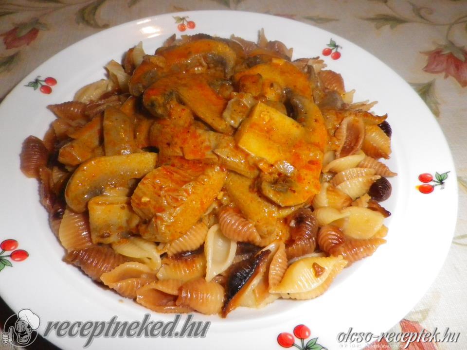 Tálaláskor a nokedlire gombát szedünk és aki szereti pici tejfölt is adhat hozzá.