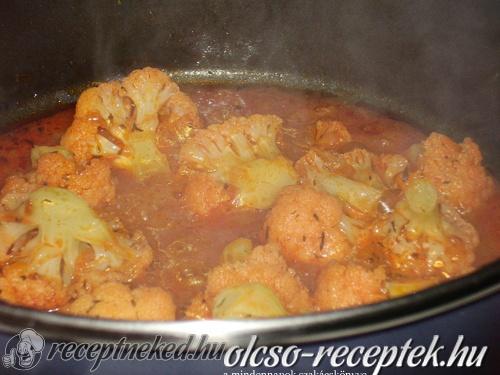 A hagymát zsíron megdinsztelem, míg üveges nem lesz, majd megszóróm ízlés szerint a fűszerekkel (jobb, ha kicsit borsosabb, mint más ételeink). Ráteszem a paradicsomot és a paprikát (lehet egyszerre is, hisz ez nem lecsó). Megvárom, míg nagyjából megfőnek (nem kell teljesen megfőzni). Ezután ráteszem a rózsáira szedett karfiolt. Kis vízzel felöntöm, és főzöm. Oda kell figyelni rá, le ne égjen. Ha elfő róla a víz, de még nyersnek bizonyul, akkor nyugodtan lehet rá önteni még. Mikor a karfiol finom puha, akkor kész is van.