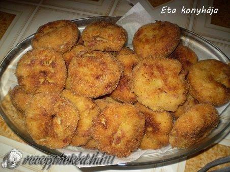 A masszából kis golyókat formázunk, meghempergetjük zsemlemorzsában, majd forró olajban aranybarnára sütjük.