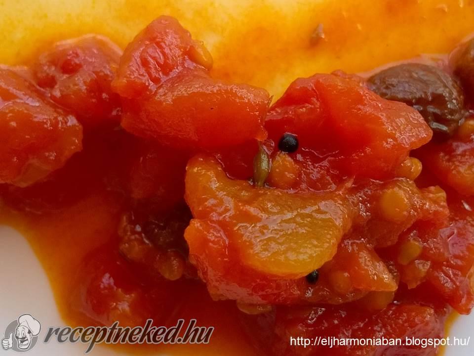 A paradicsomok csumájánál X alakban vágj bele késsel, majd forró vízbe mártjuk, kiszedjük, meghámozzuk és nagyobb darabokra vágjuk.