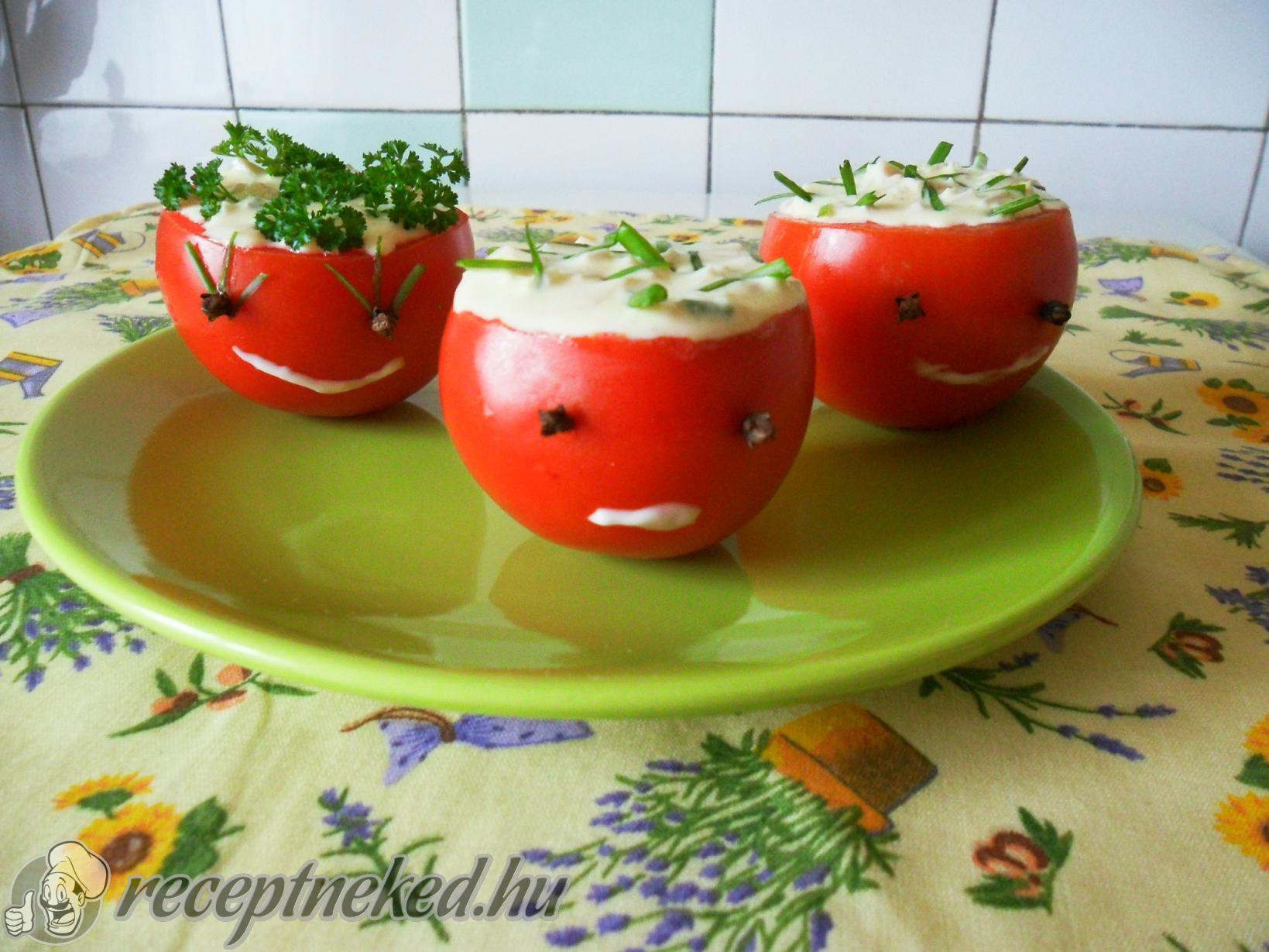 A paradicsomokat megmossuk, a tetejüket levágjuk és a belsejüket kikaparjuk.